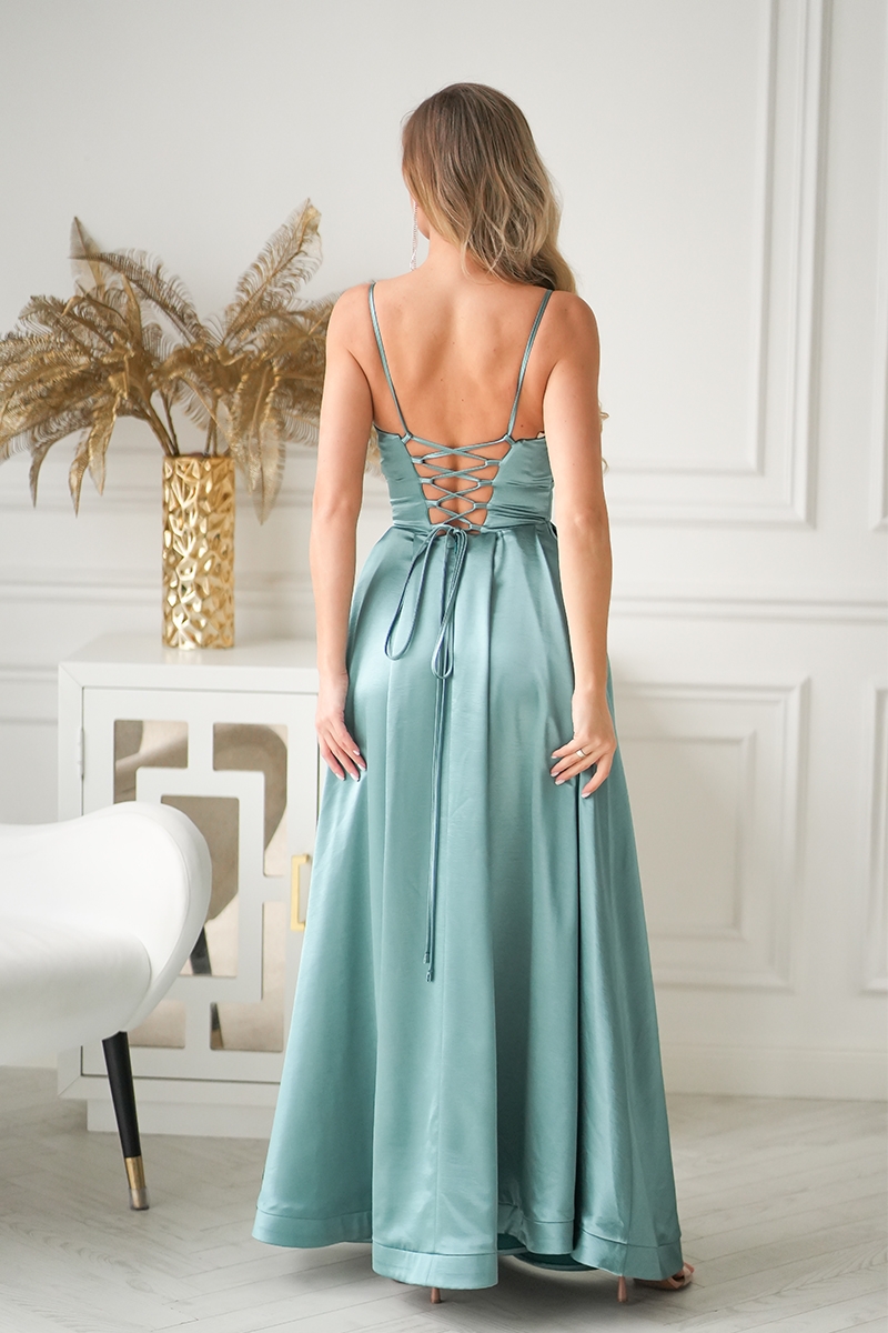 szałwiowa suknia wieczorowa, sukienka w kolorze szałwiowym, suknia balowa, sukienka maxi elegancka, sukienka na wesele, sukienka na studniówkę, sukienka satynowa, sukienka z gorsetem, sukienka z wiązaniem na plecach, elegancka sukienka damska, sukienka na bal, sukienka premium, efektowna suknia