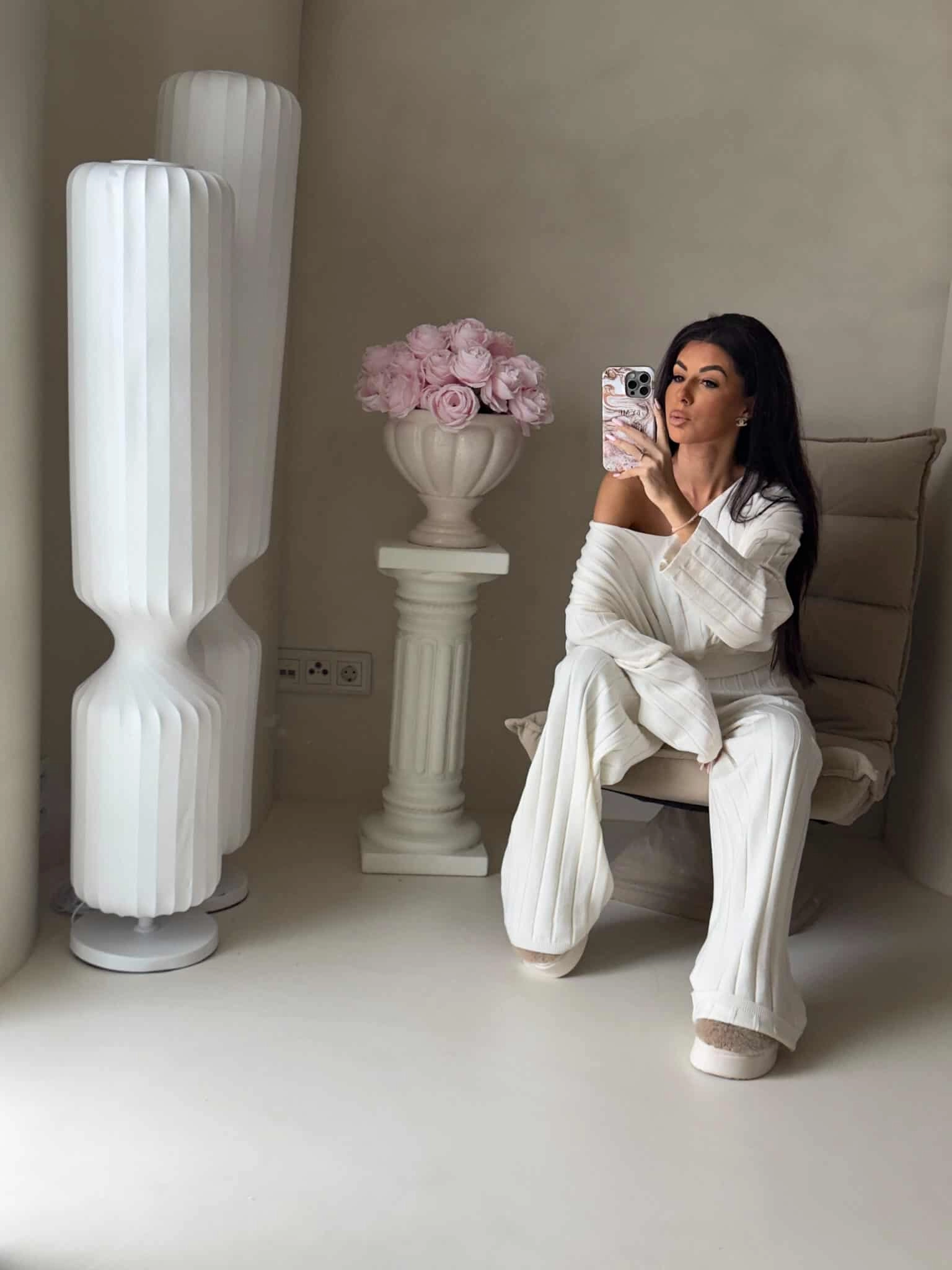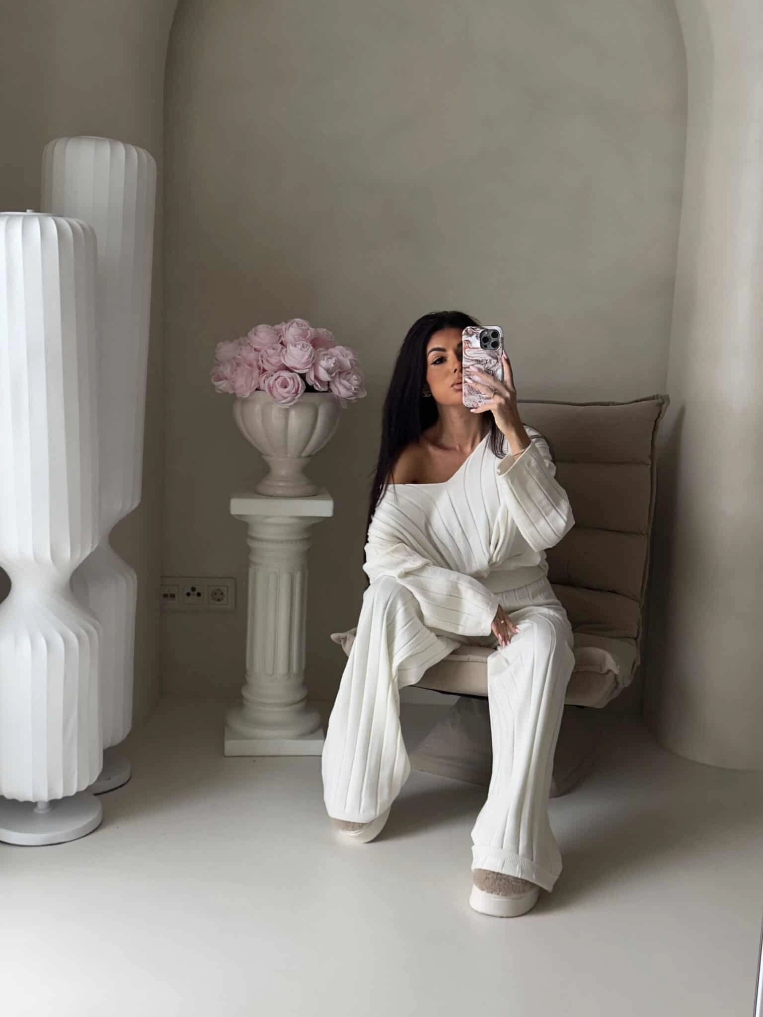 Komplet CANDICE to połączenie komfortu i ponadczasowej elegancji w nowoczesnym wydaniu. Zestaw składa się z oversize’owego swetra z dekoltem w serek oraz spodni z wysokim stanem, wykonanych z miękkiej, przyjemnej w dotyku dzianiny, która idealnie dopasowuje się do sylwetki.