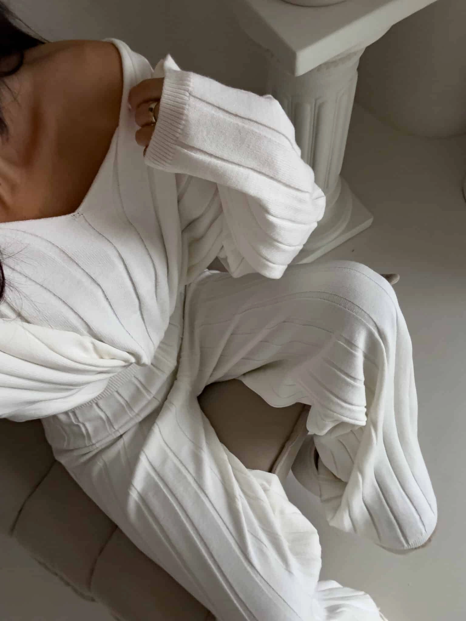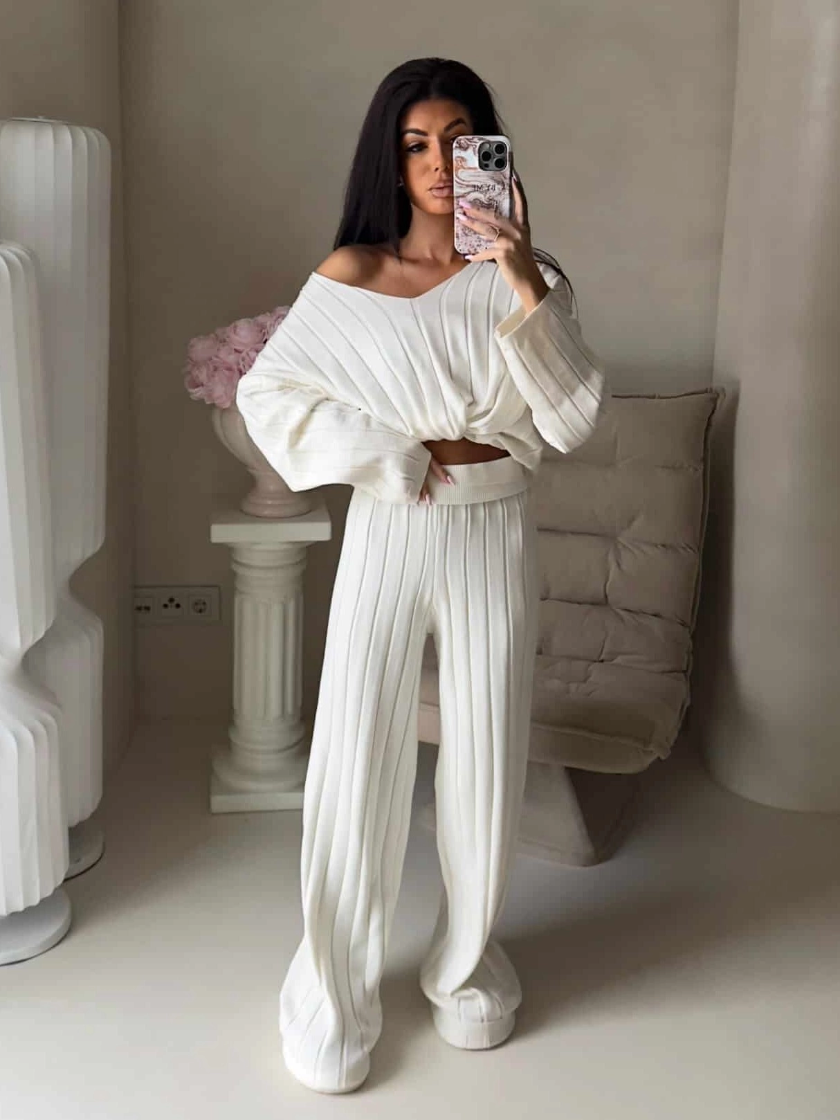 CANDICE ecru komplet sweterkowy z szerokimi nogawkami