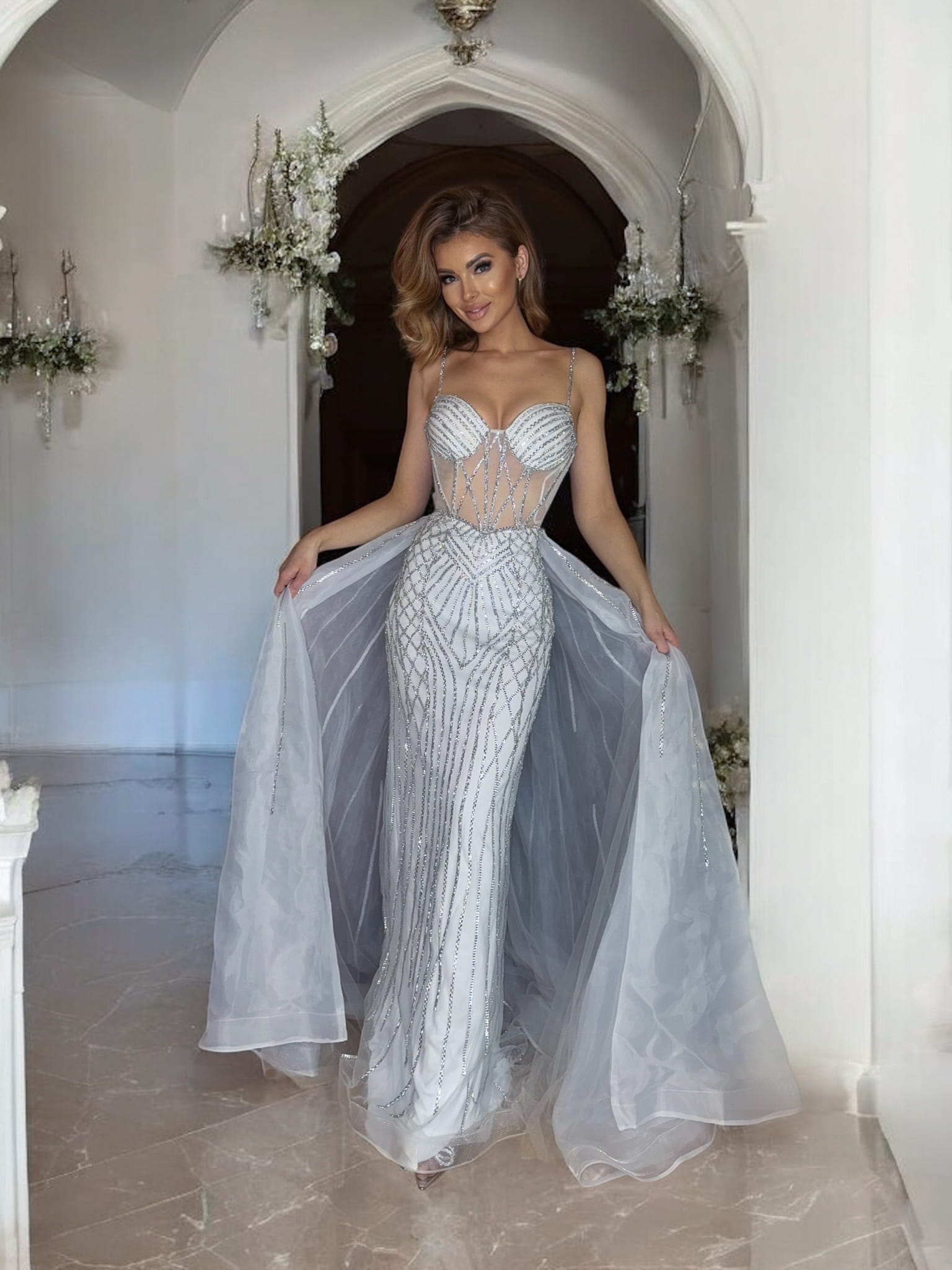 Sukienka CAROLINE to kreacja, która łączy w sobie klasyczną elegancję z nowoczesnym blaskiem. W czystej bieli, ta maxi sukienka wyróżnia się dopasowanym krojem, który pięknie podkreśla sylwetkę, oraz subtelnym cekinowym wykończeniem, które nadaje jej wyjątkowego blasku. Dodatkowo, półspódnica z tiulu w dolnej części sukienki dodaje lekkości i zwiewności, tworząc efektowny, elegancki look. Idealna na specjalne okazje, takie jak wesela, gale czy eleganckie przyjęcia.