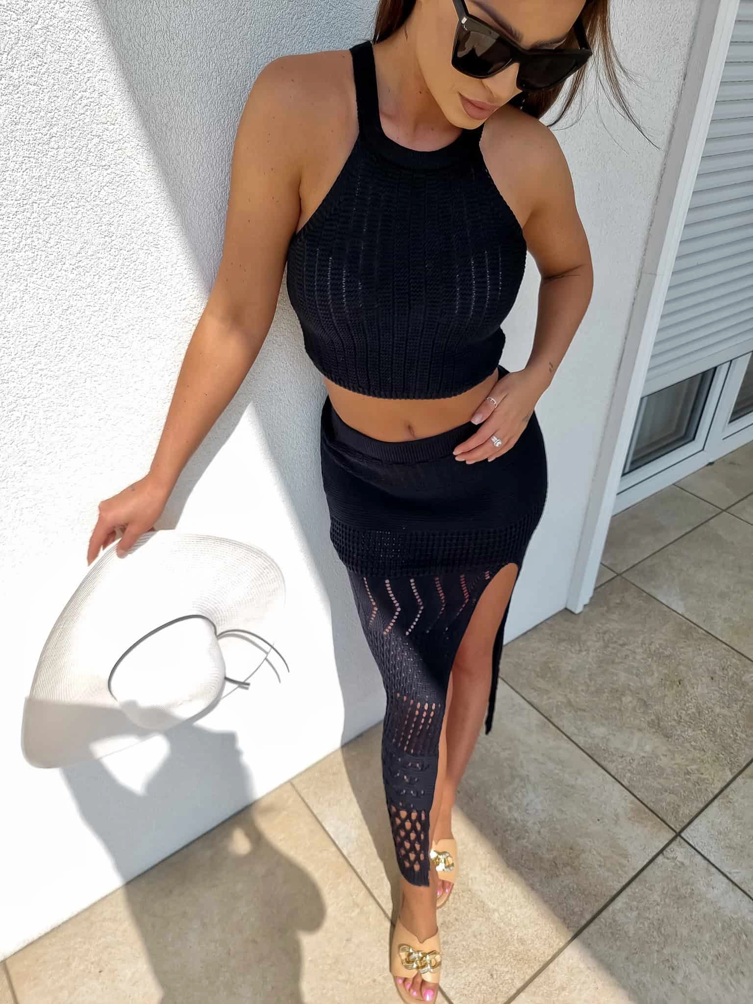 CYPRUS czarny letni komplet top i spódnica z rozcięciem