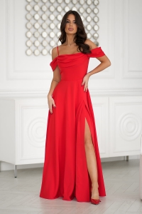 Słowa kluczowe: czerwona sukienka maxi, sukienka z opadającymi ramiączkami, długa sukienka z rozcięciem, elegancka sukienka na wieczór, sukienka na wesele, sukienka zmysłowa.