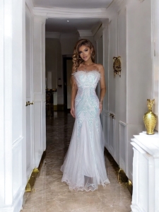 DEL CARMEN – Biała suknia ślubna maxi syrenka z cekinami i piórkami