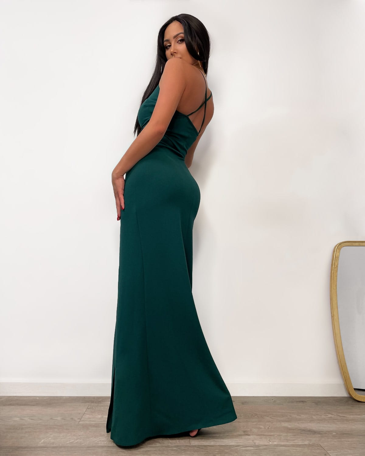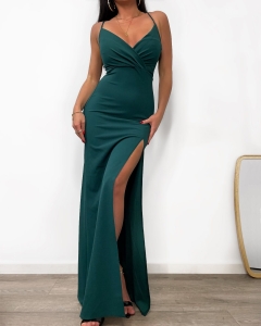 DIVINE butelkowa zielona sukienka maxi z rozcięciem