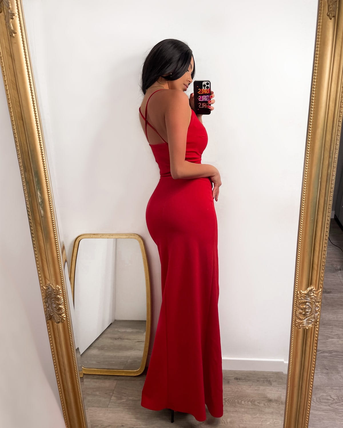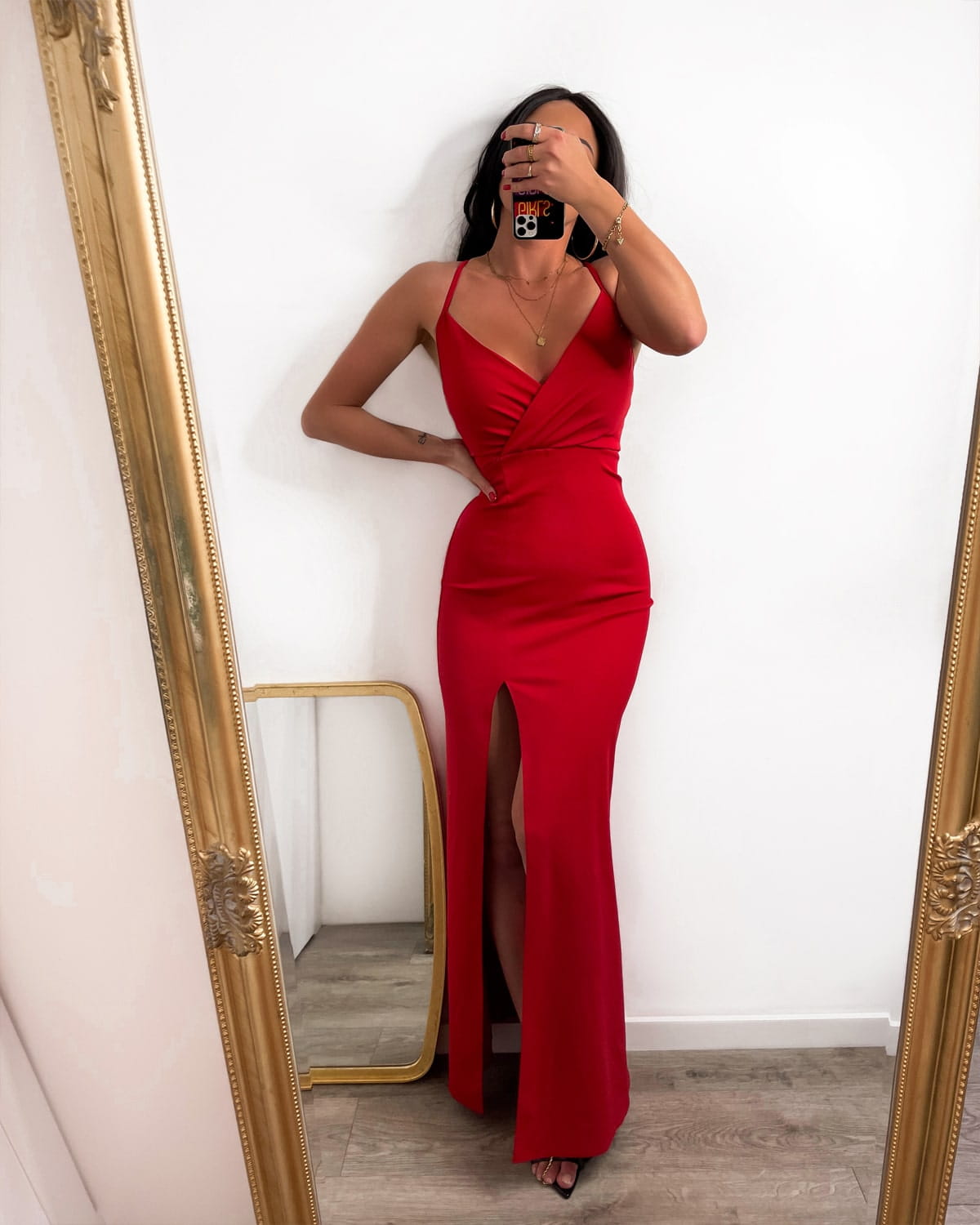 Przepiękna, wieczorowa sukienka maxi uszyta z eleganckiego, nieprześwitującego i delikatnie elastycznego materiału. Sukienka ma ramiączka na krzyż, głęboki dekolt i rozcięcie na nodze. Krój jest prosty, ale pięknie podkreśla figurę. Sukienka idealna na wesele, studniówki lub Sylwestra. Sprawdzi się na każdej wyjątkowej okazji! Produkt polski.