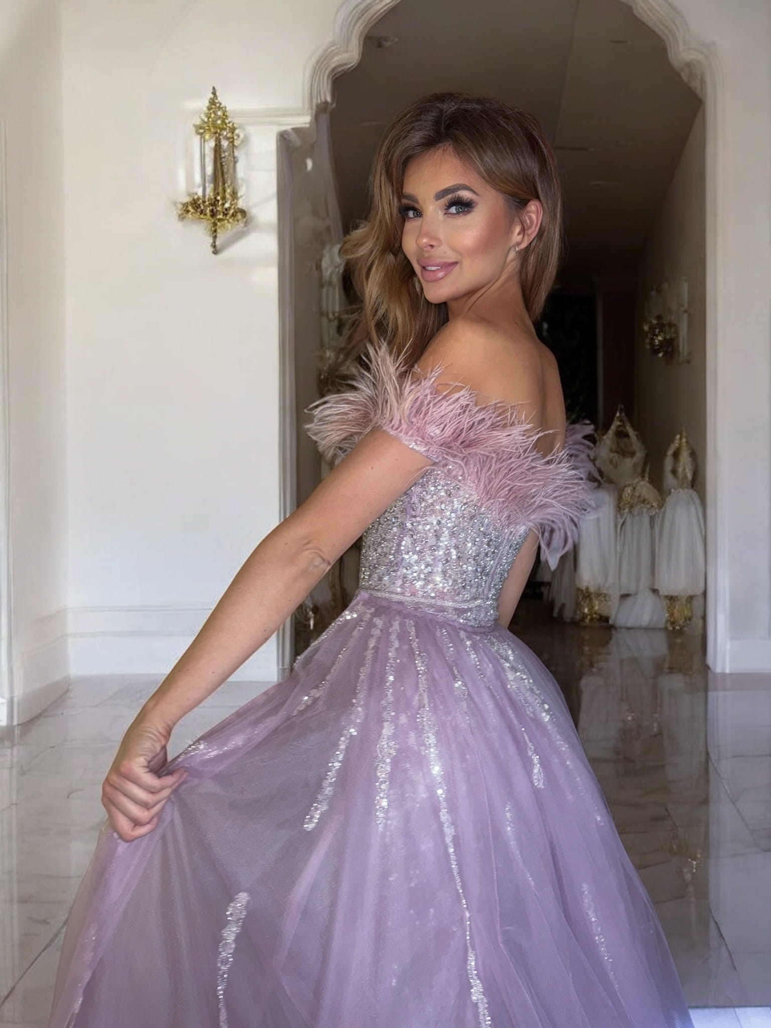 EMPIRE – wrzosowa sukienka maxi z piórkami i rozporkiem
