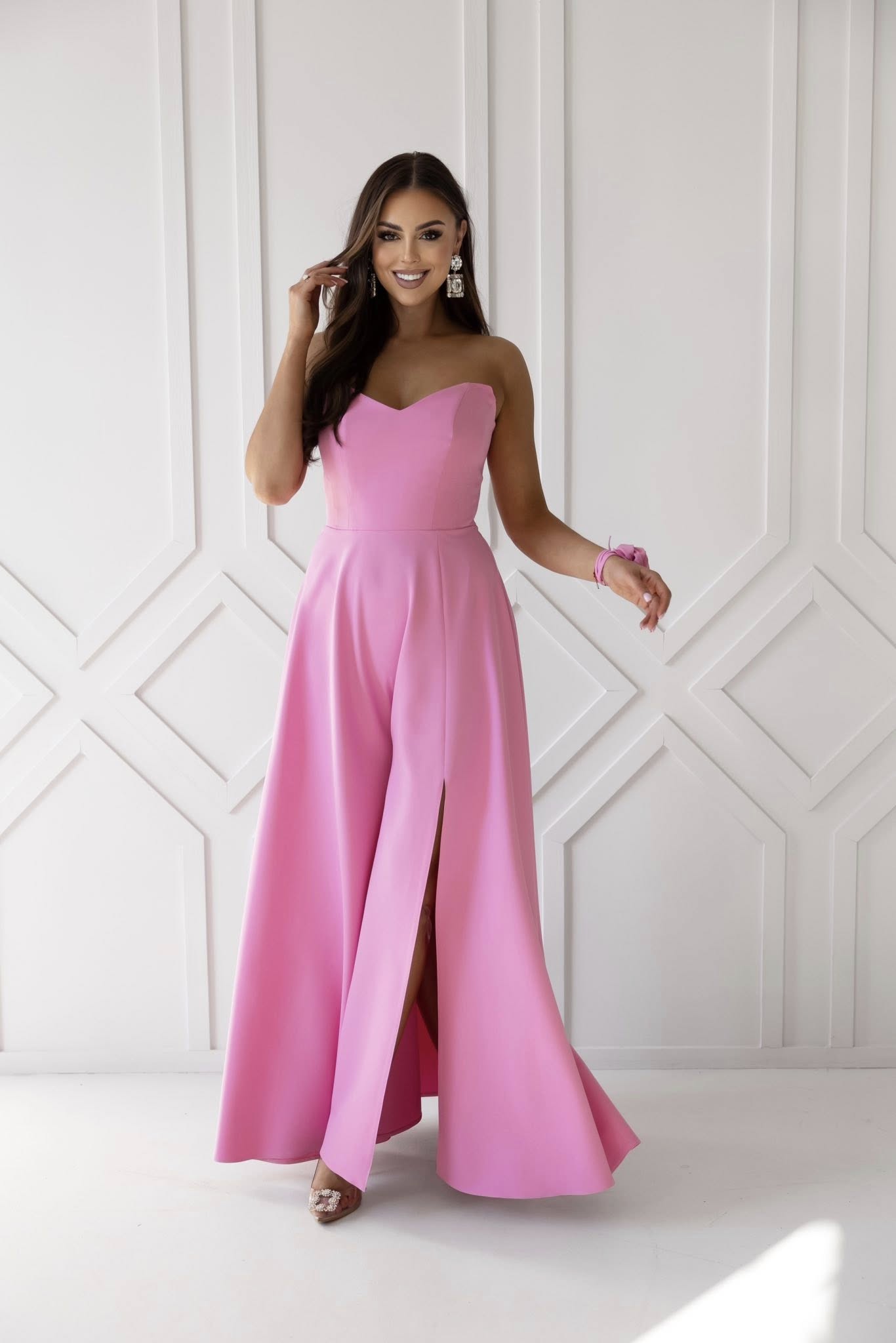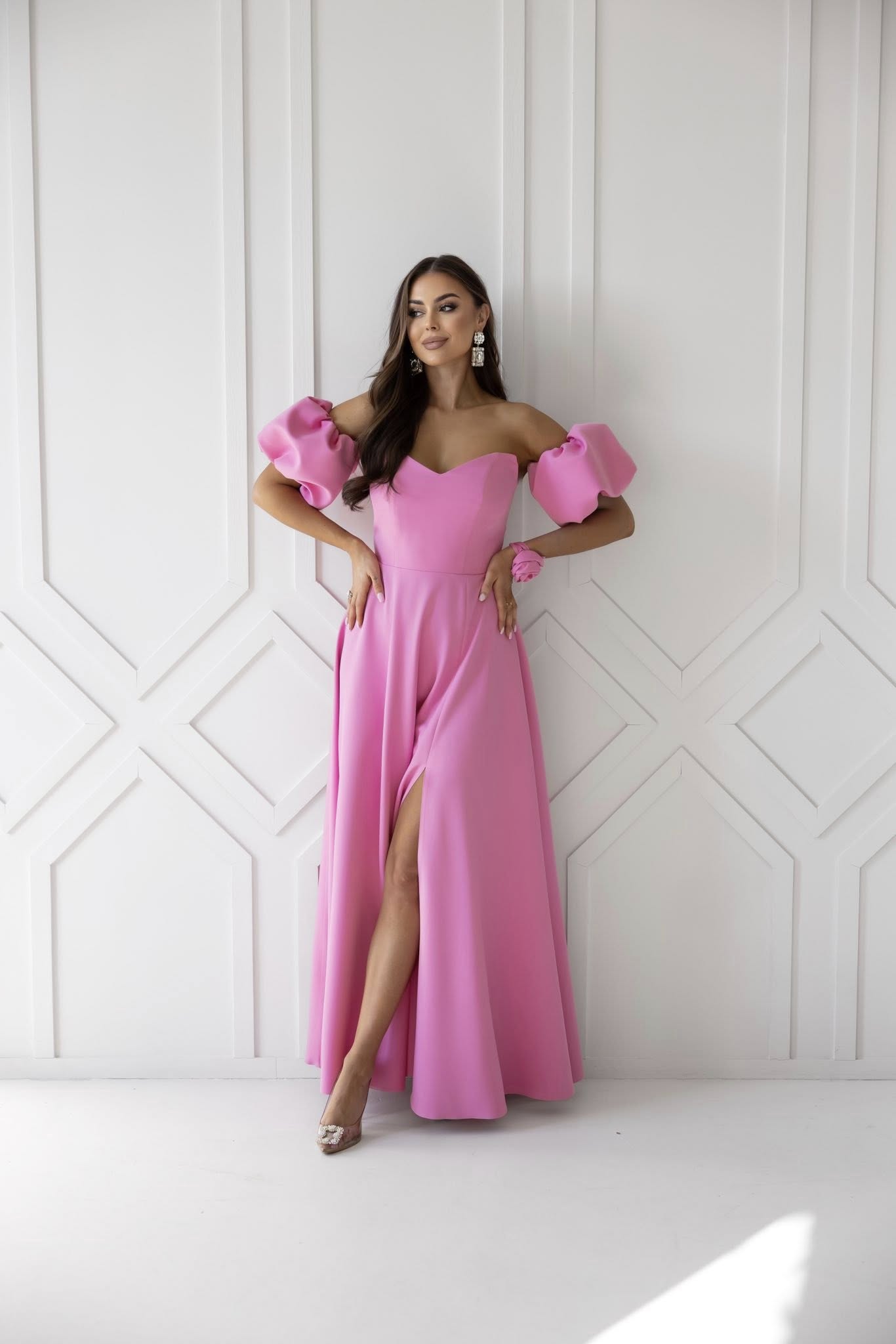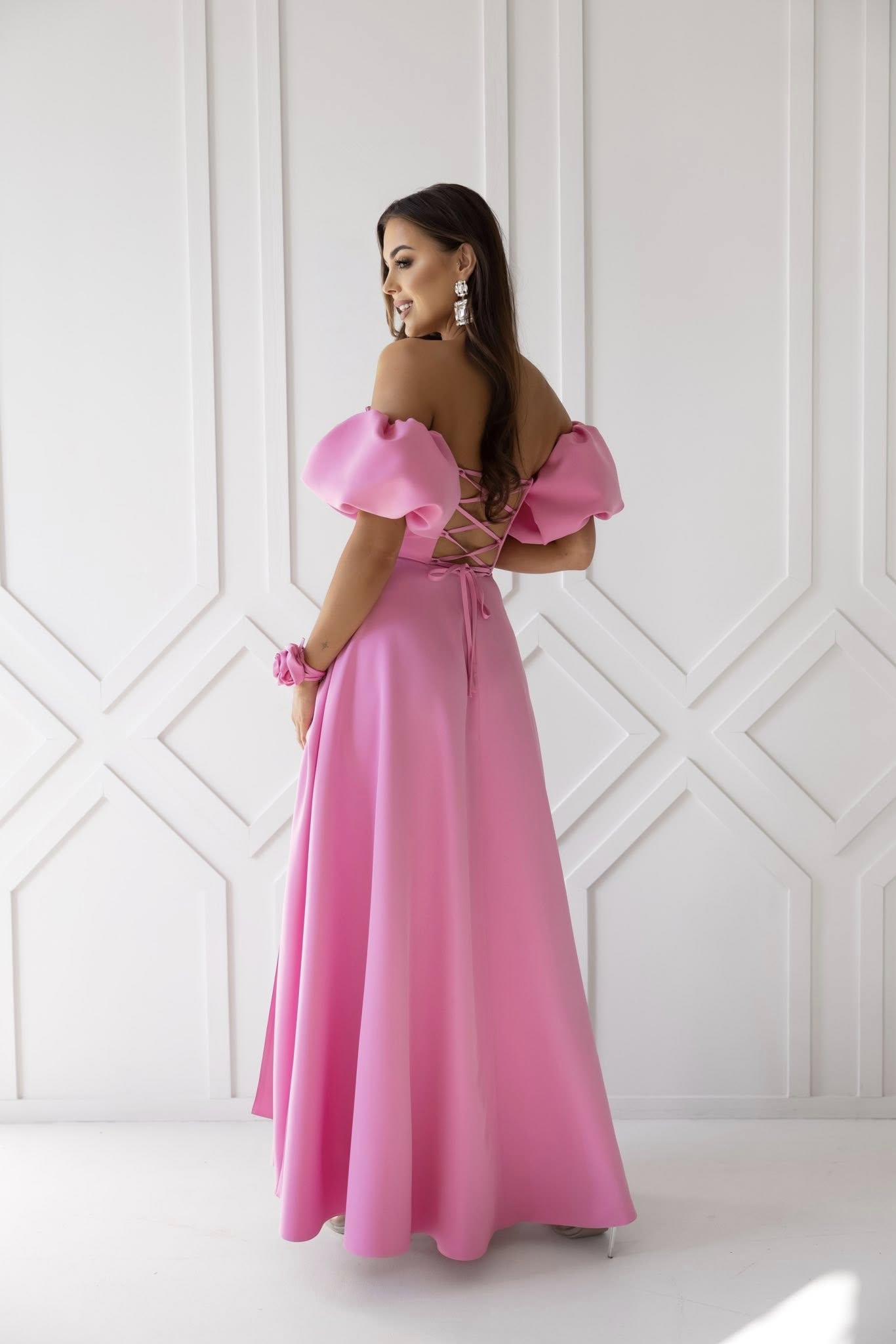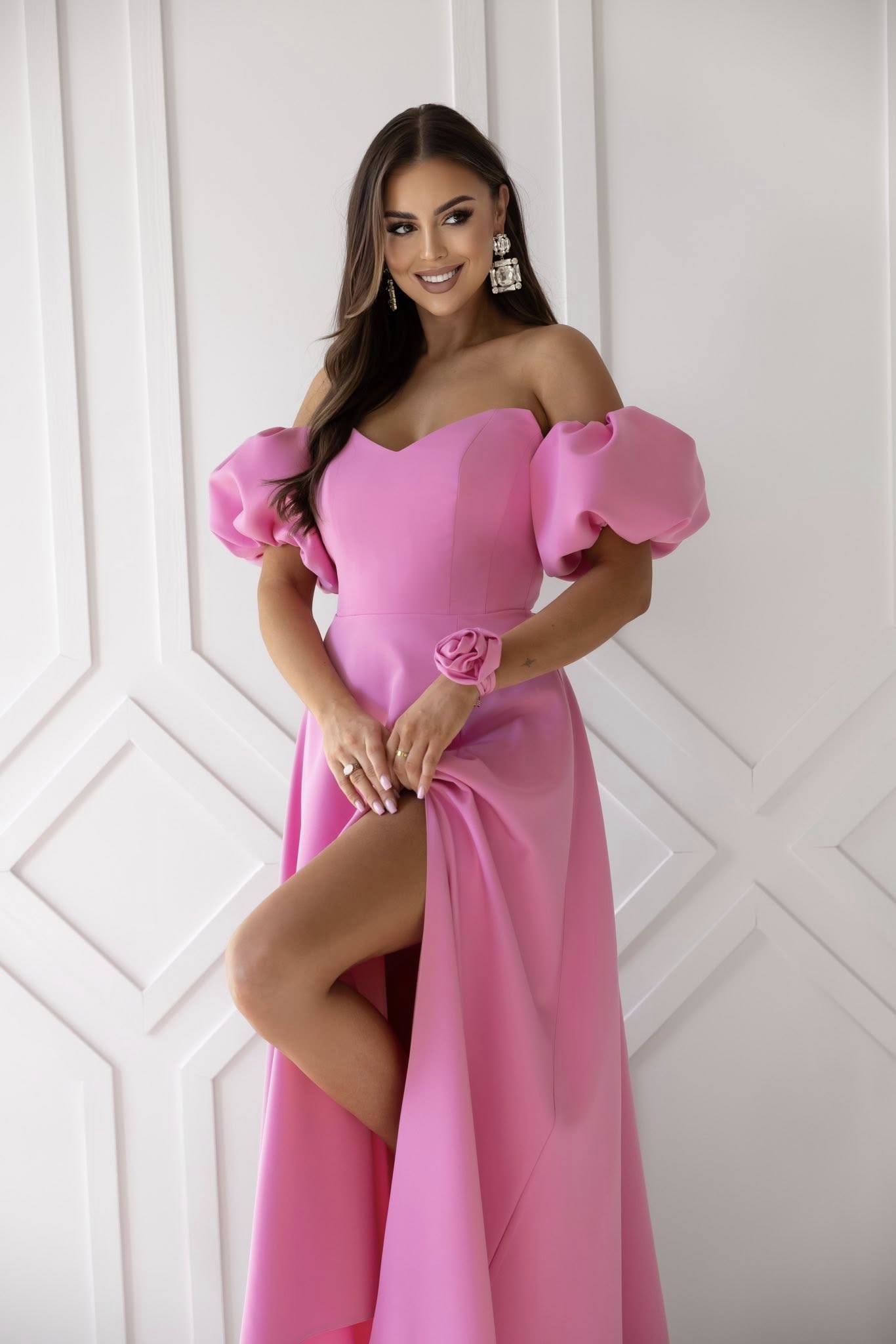 ESMERALDA cukierkowy róż sukienka maxi z bufkami na ramionach