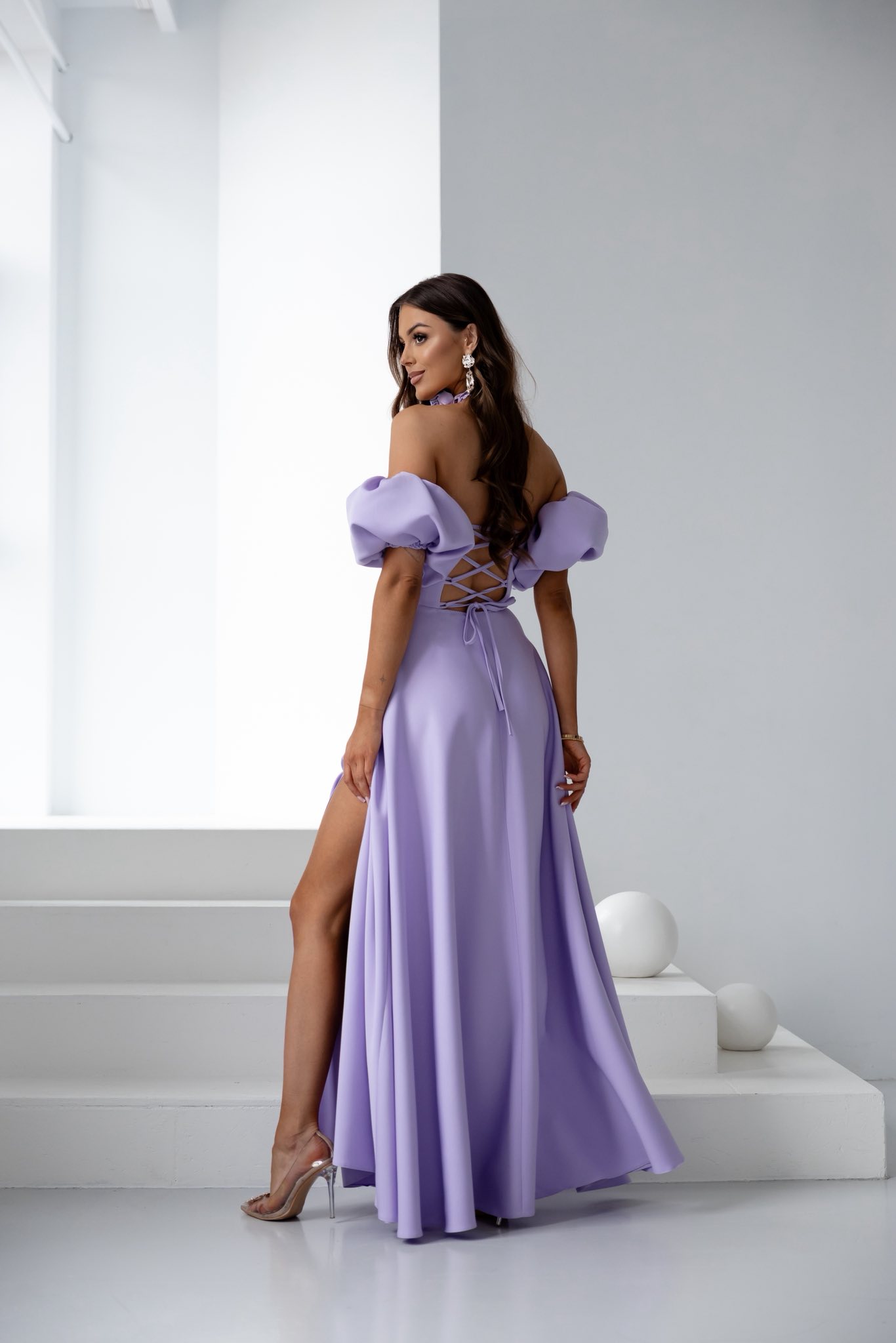 - Gorsetowe wiązanie z tyłu – zapewnia doskonałe dopasowanie do sylwetki, jednocześnie eksponując plecy w szykowny sposób.
