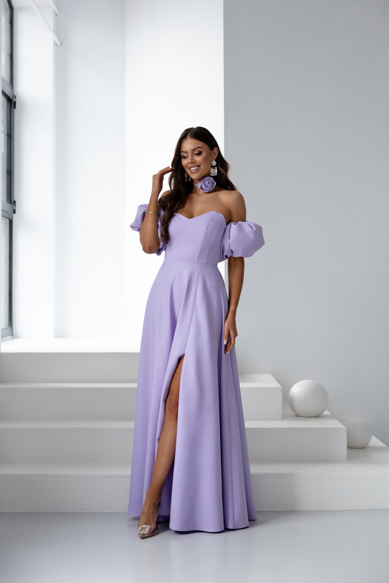 ESMERALDA liliowa sukienka maxi z bufkami na ramionach