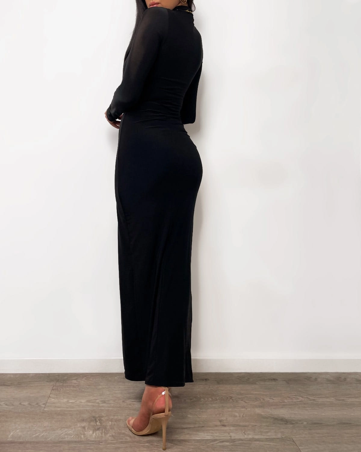 Długa, wieczorowa sukienka z rozcięciem na nodze. Sukienka jest bardzo kobieca i zmysłowa, dostępna w drapieżnych printach i klasycznej czerni. Rozcięcie na nodze, długi rękaw, półgolf. Produkt polski.