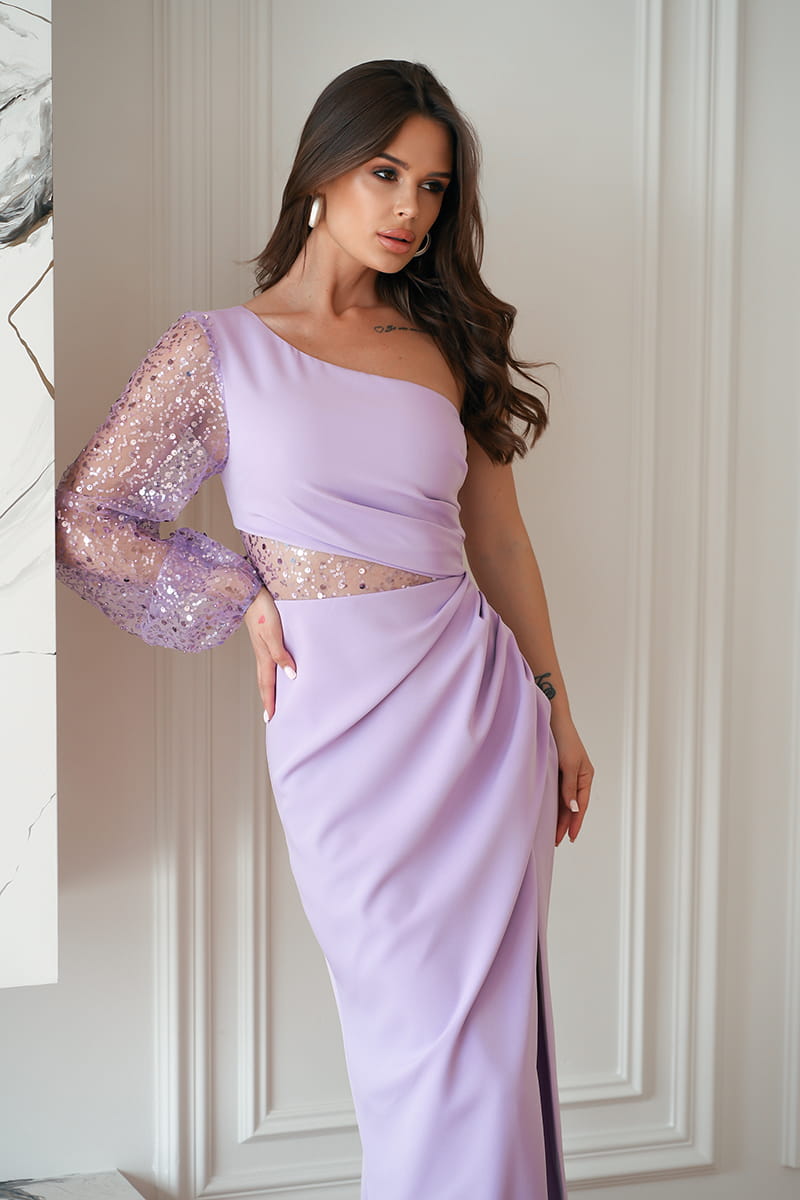 Ta olśniewająca sukienka wieczorowa w stonowanym odcieniu lawendy to perfekcyjne połączenie szyku i wygody. Z pięknym cekinowym rękawem na jedno ramię i asymetryczną górą z wstawką z cekinów, ta kreacja emanuje wyrafinowanym stylem i elegancją.