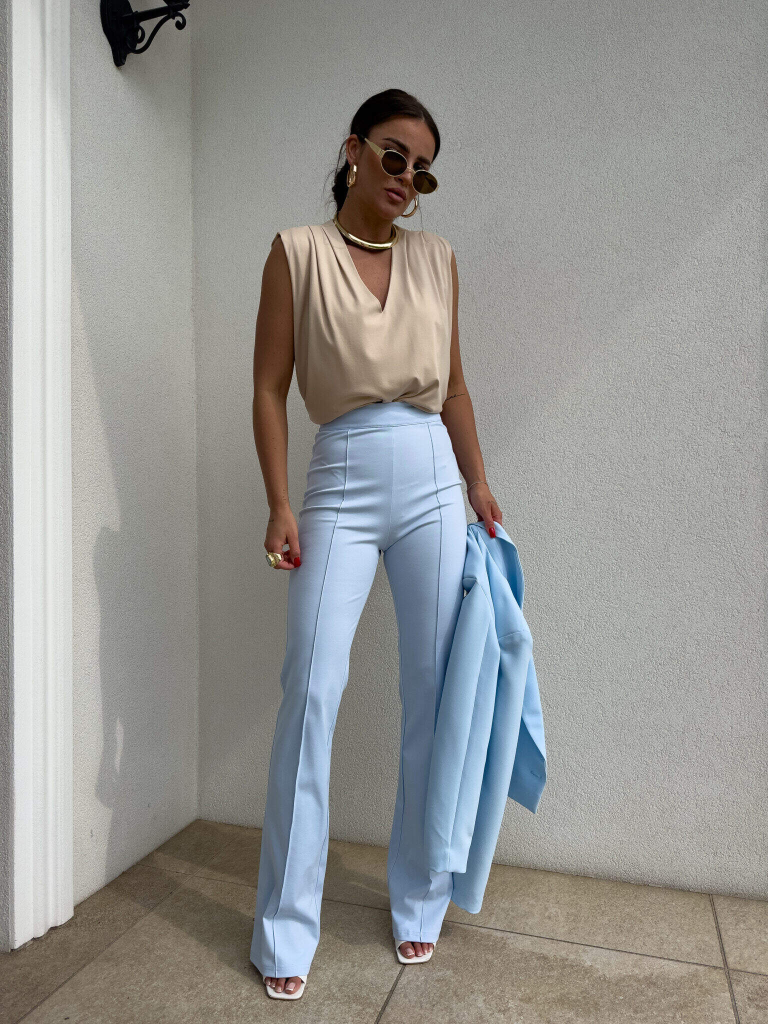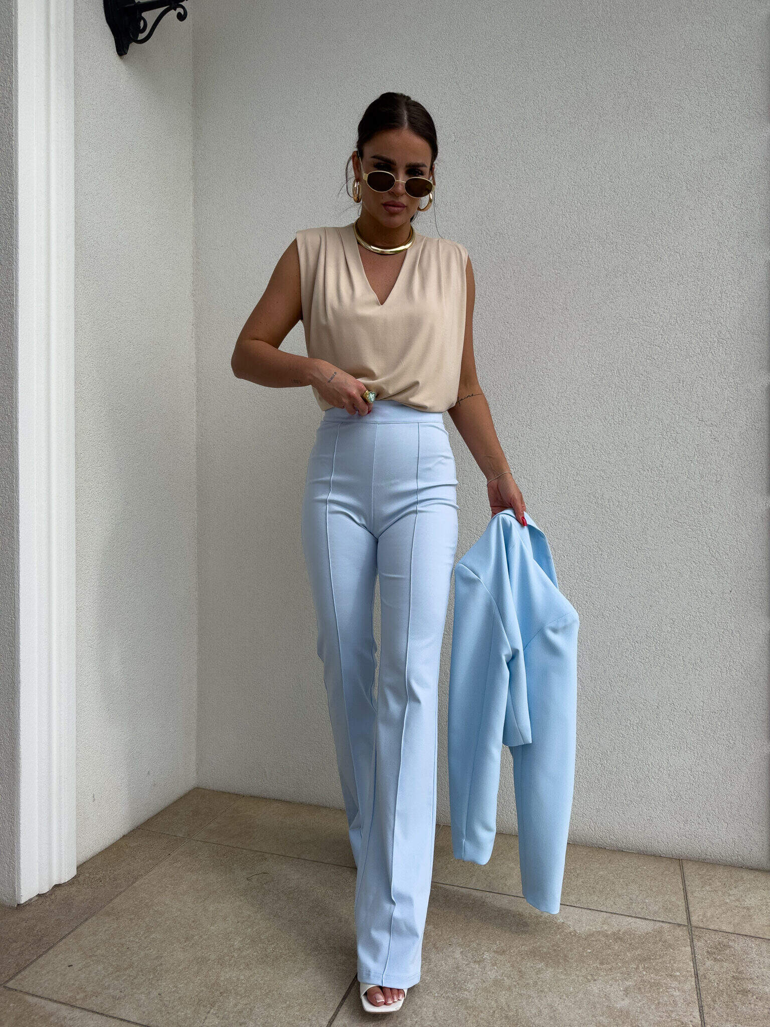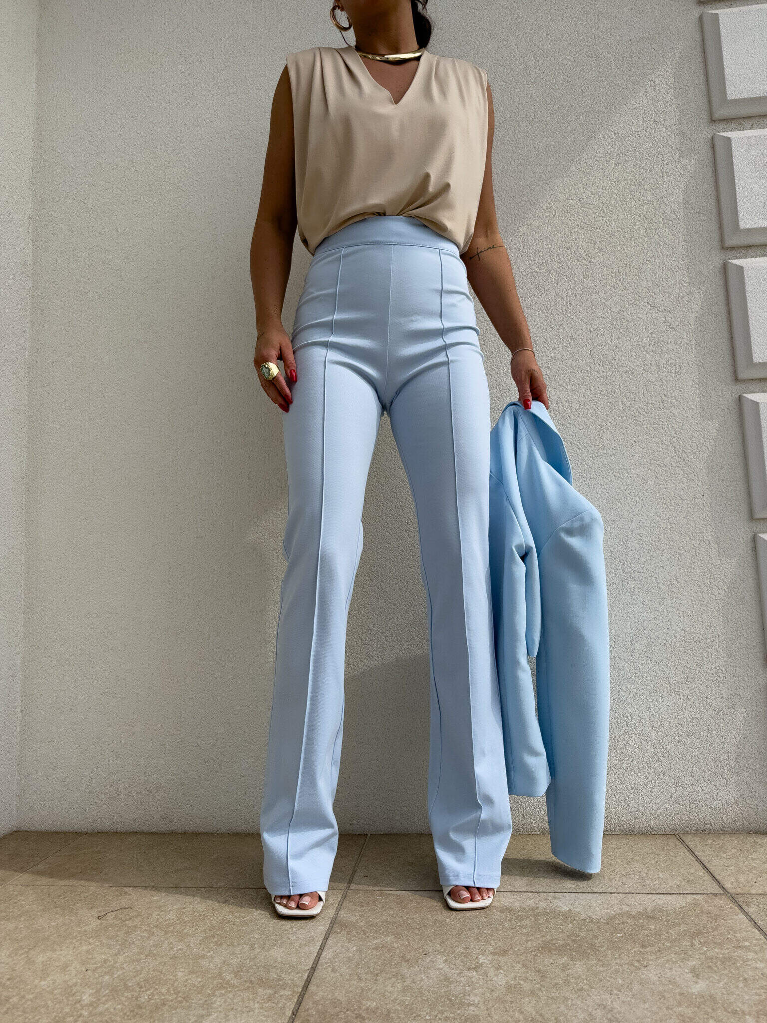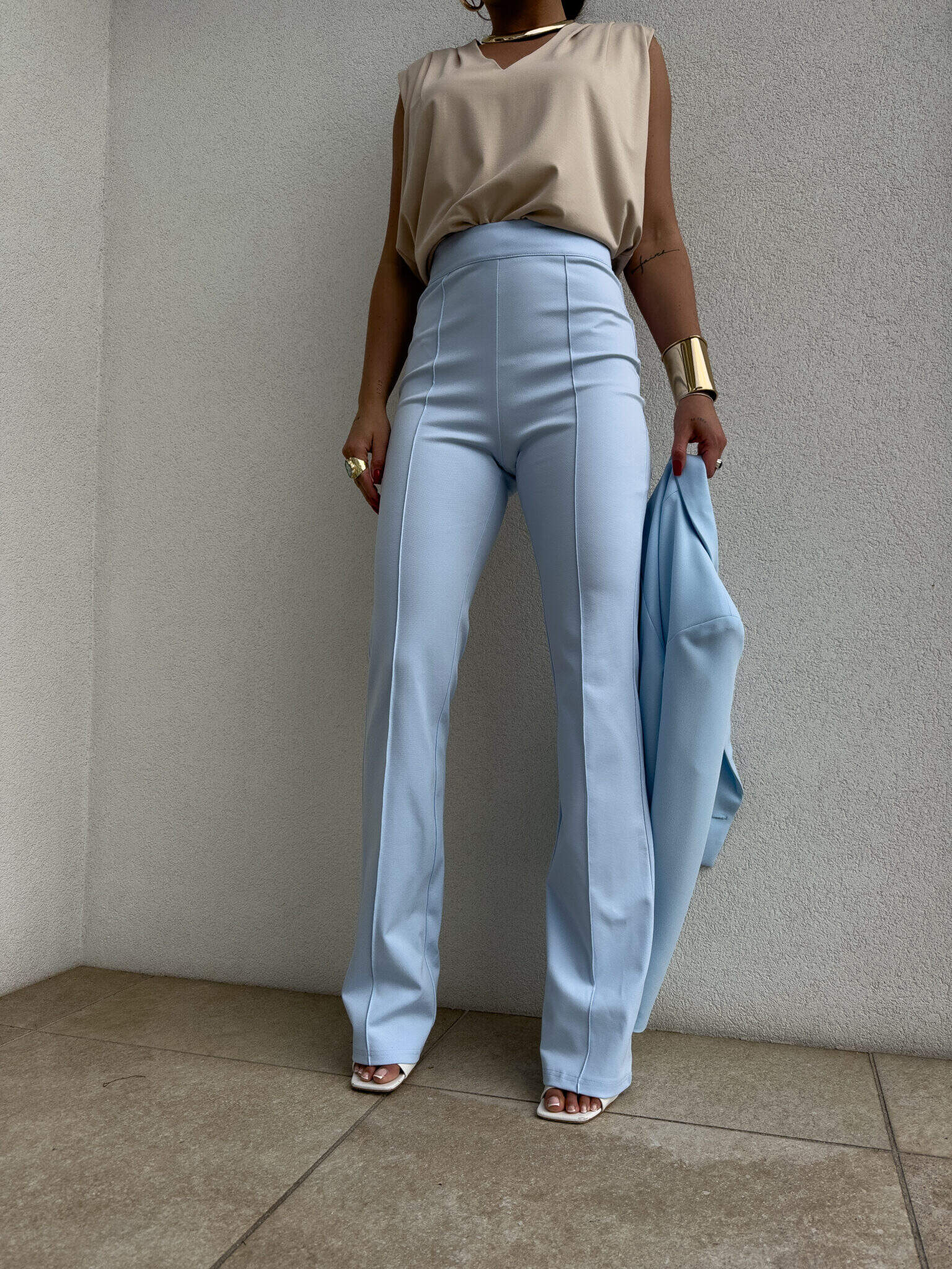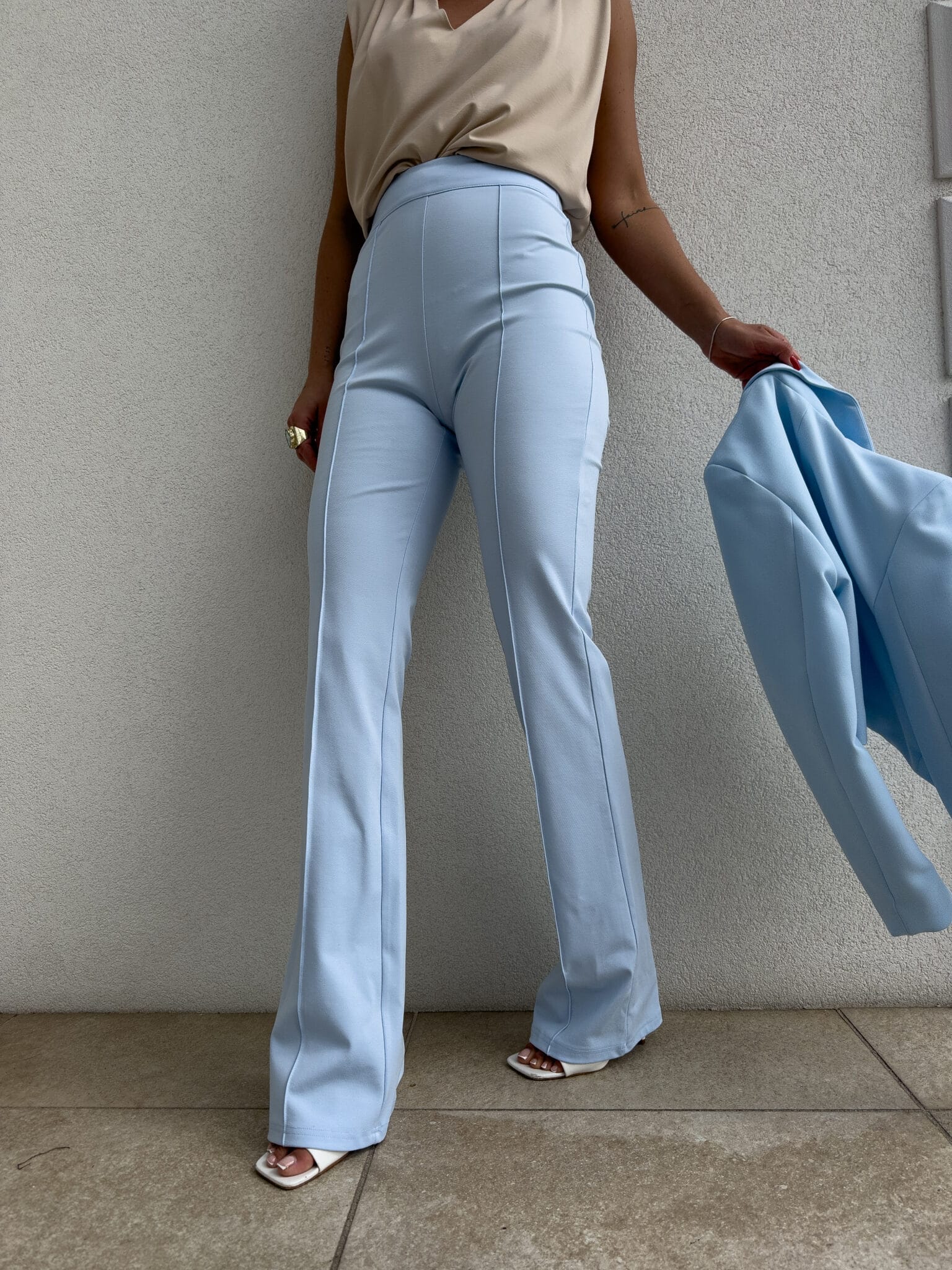 Spodnie idealnie przylegają w talii i biodrach, podkreślając kobiece kształty, a następnie subtelnie rozszerzają się ku dołowi, nadając sylwetce lekkości i proporcji. Pionowe przeszycie dodatkowo optycznie wysmukla nogi i nadaje całości eleganckiego wykończenia.