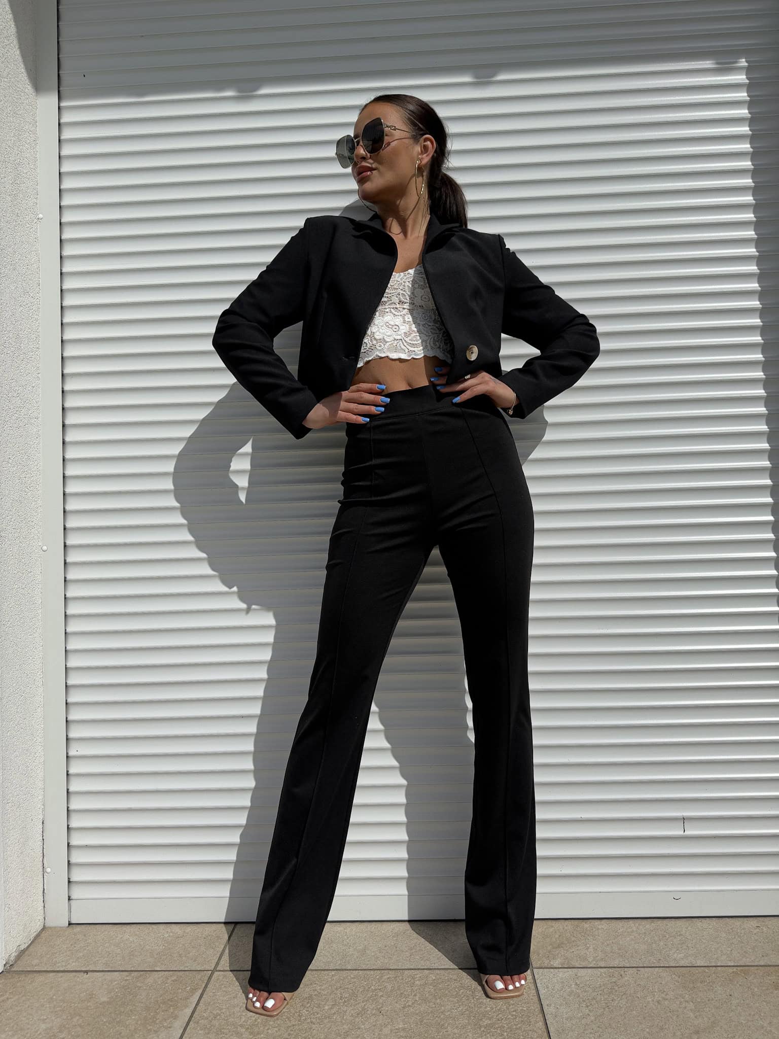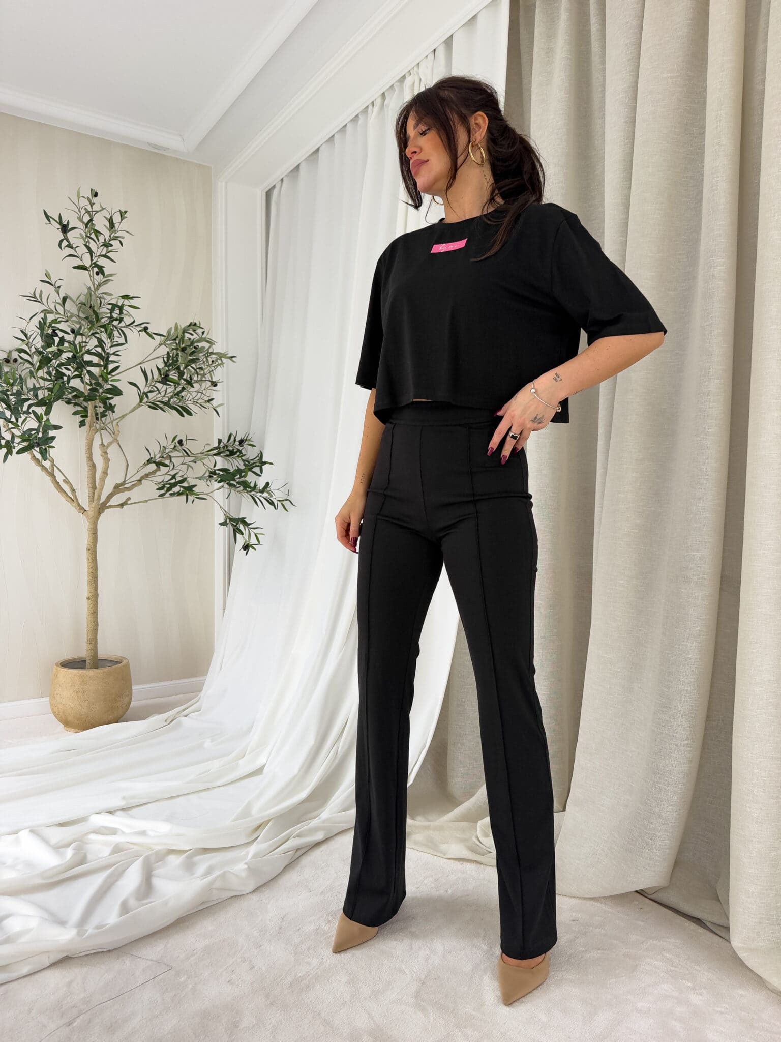 Spodnie idealnie przylegają w talii i biodrach, podkreślając kobiece kształty, a następnie subtelnie rozszerzają się ku dołowi, nadając sylwetce lekkości i proporcji. Pionowe przeszycie dodatkowo optycznie wysmukla nogi i nadaje całości eleganckiego wykończenia.