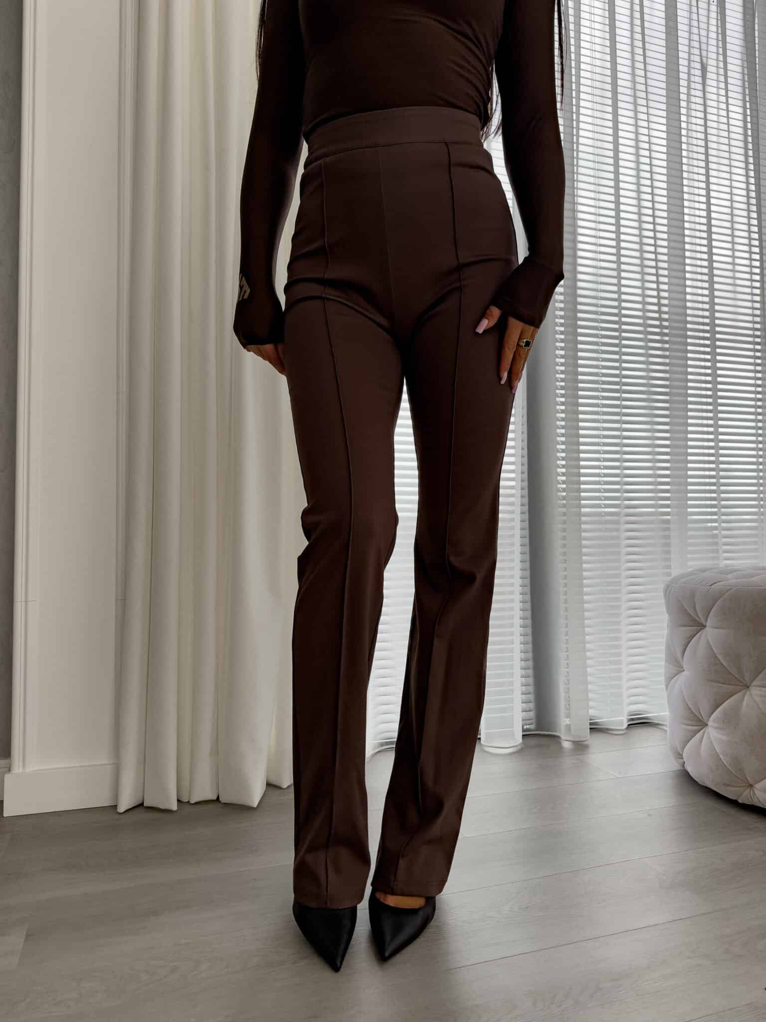 Spodnie idealnie przylegają w talii i biodrach, podkreślając kobiece kształty, a następnie subtelnie rozszerzają się ku dołowi, nadając sylwetce lekkości i proporcji. Pionowe przeszycie dodatkowo optycznie wysmukla nogi i nadaje całości eleganckiego wykończenia.