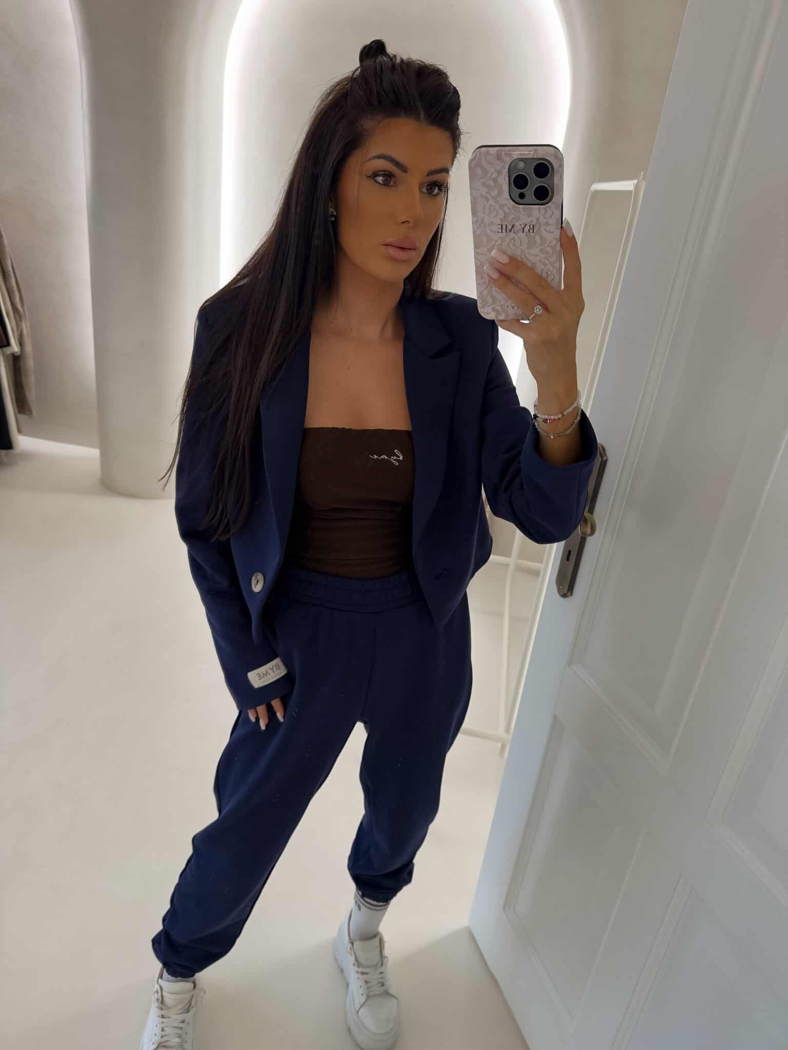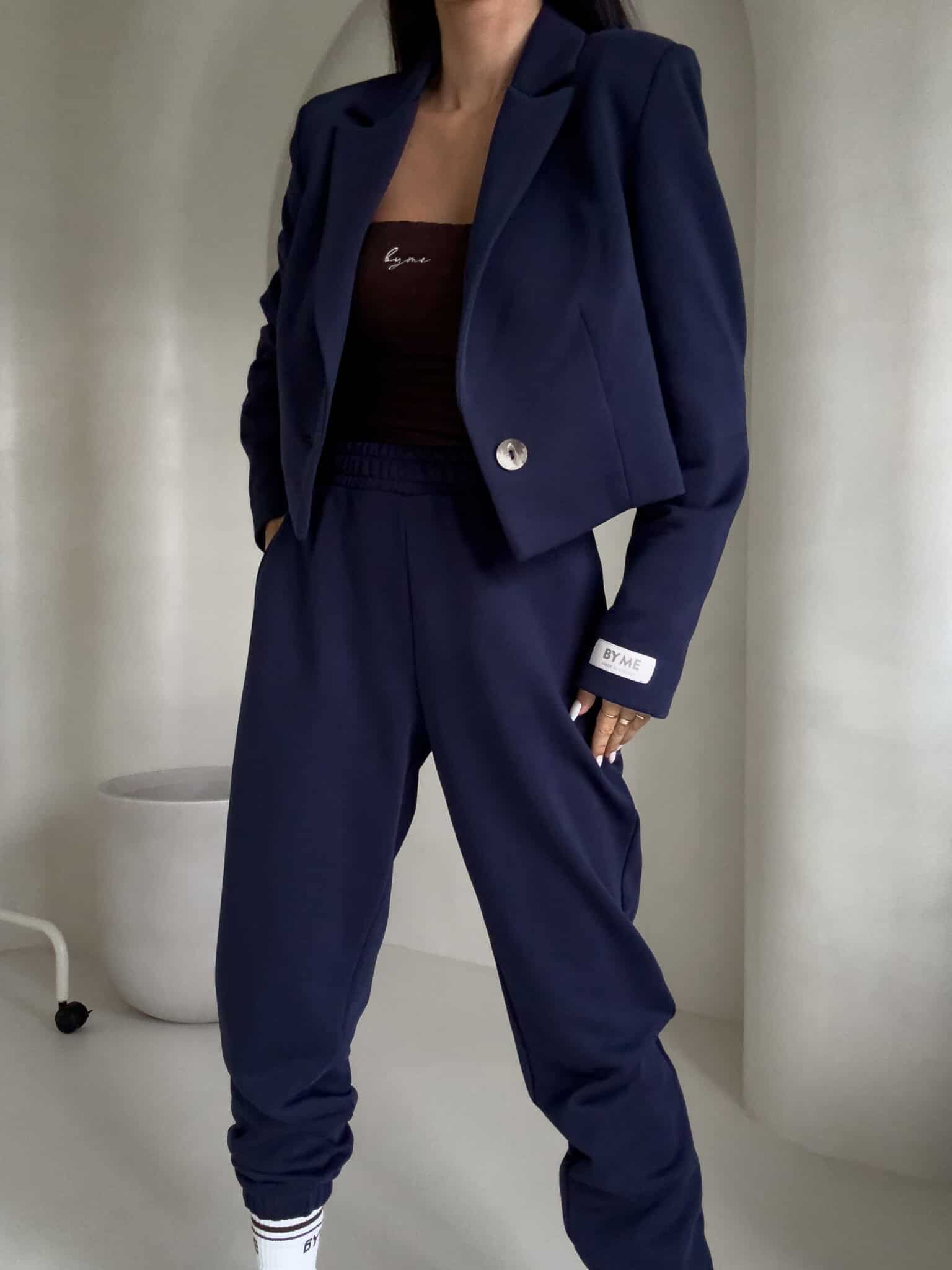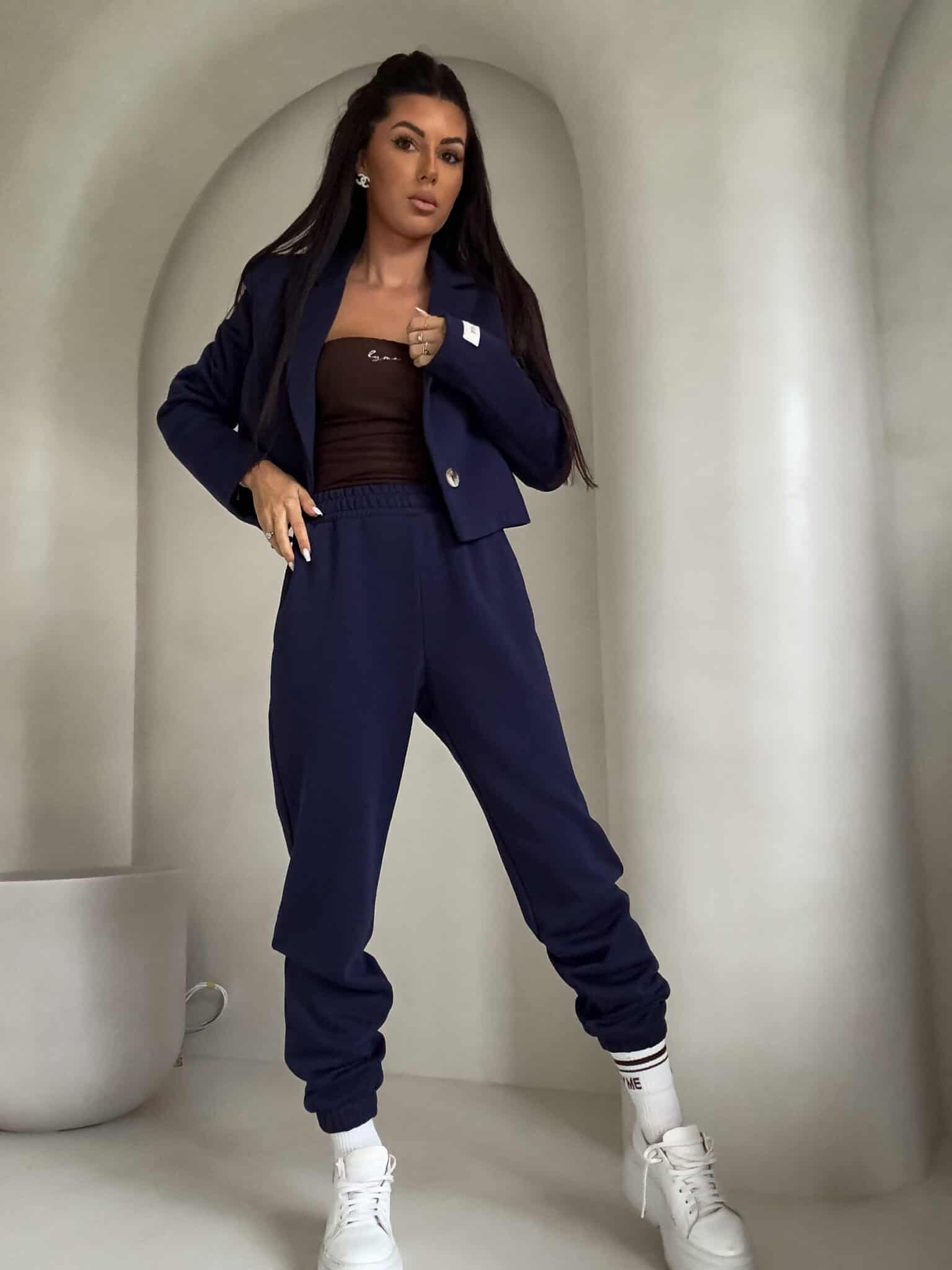 Spodnie idealnie układają się na ciele, podkreślając talię i linię bioder. Elastyczny pas zapewnia perfekcyjne dopasowanie, a ściągacze na dole nogawek nadają całości sportowego charakteru i optycznie wysmuklają nogi.