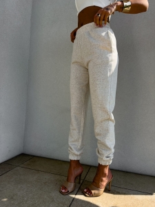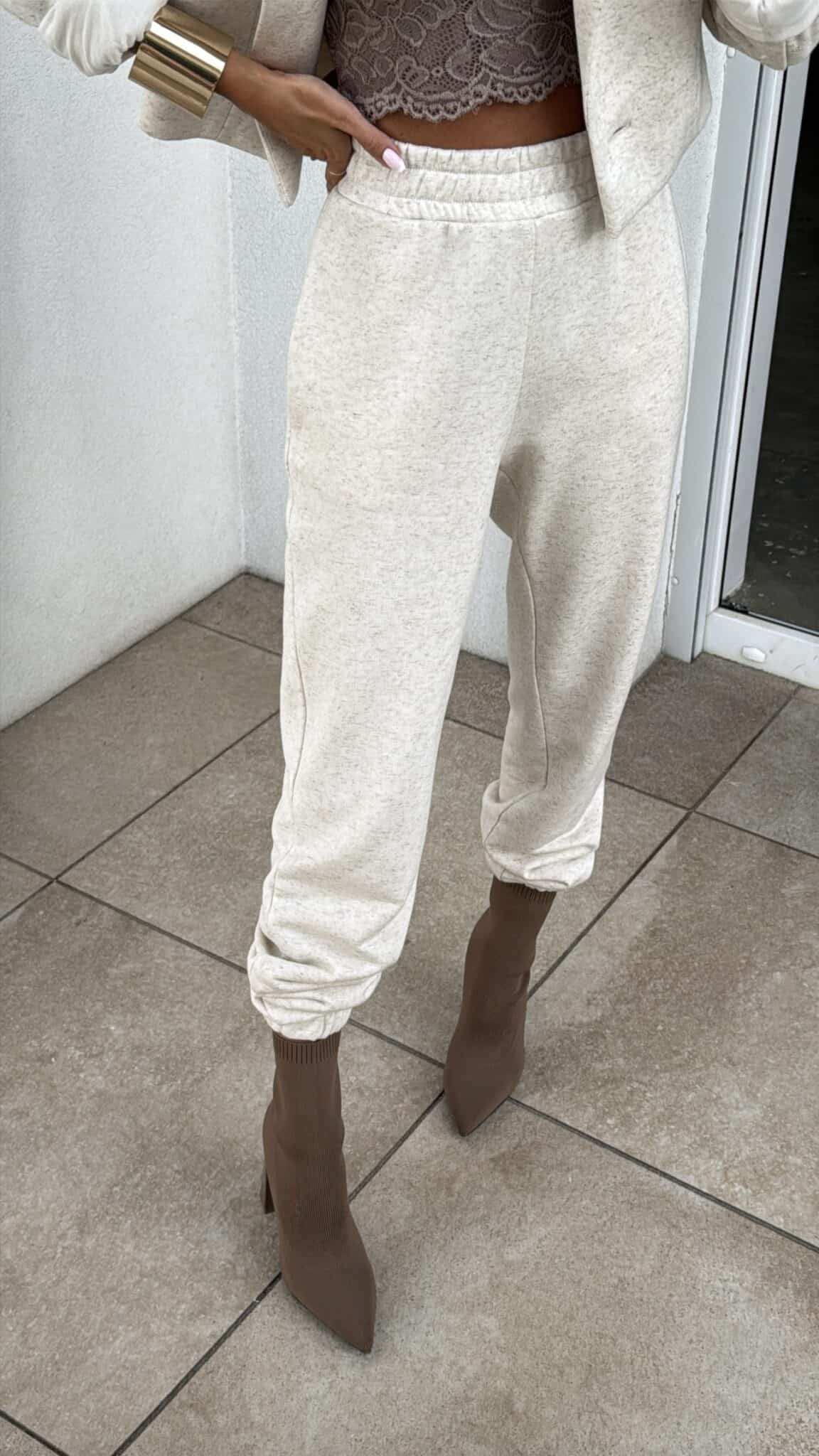 Spodnie idealnie układają się na ciele, podkreślając talię i linię bioder. Elastyczny pas zapewnia perfekcyjne dopasowanie, a ściągacze na dole nogawek nadają całości sportowego charakteru i optycznie wysmuklają nogi.
