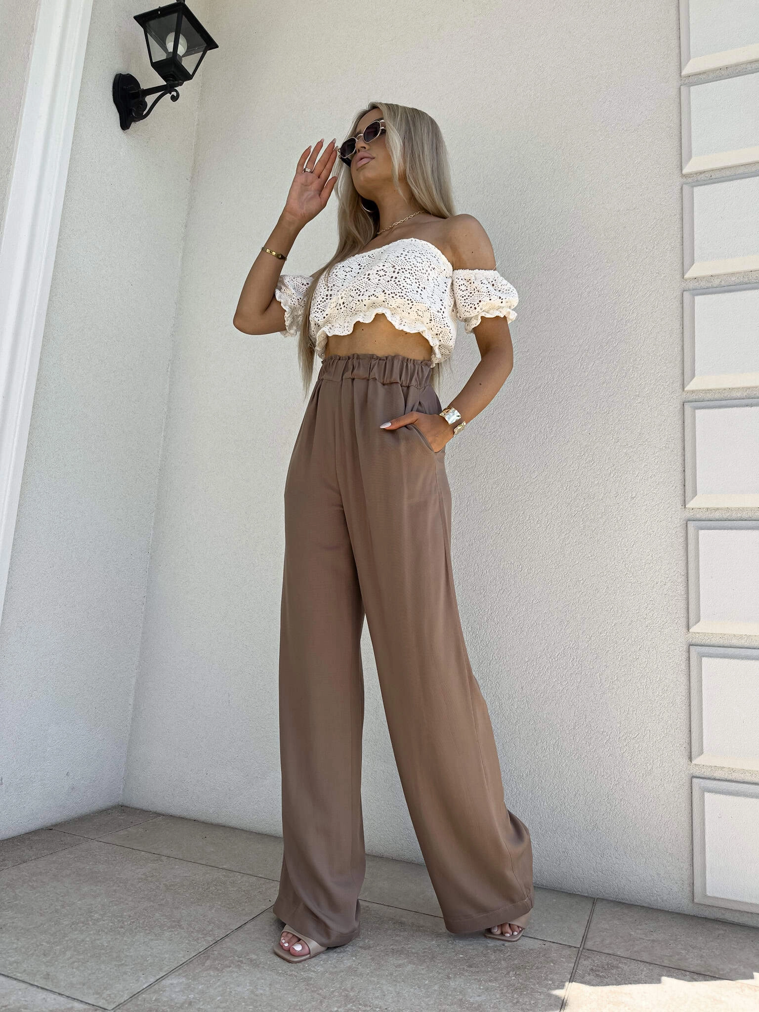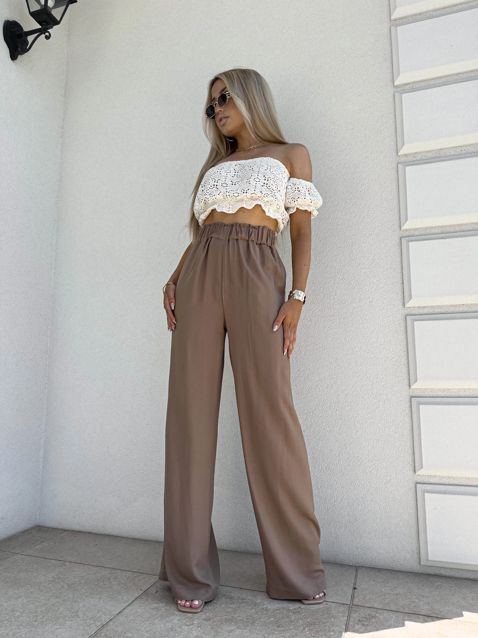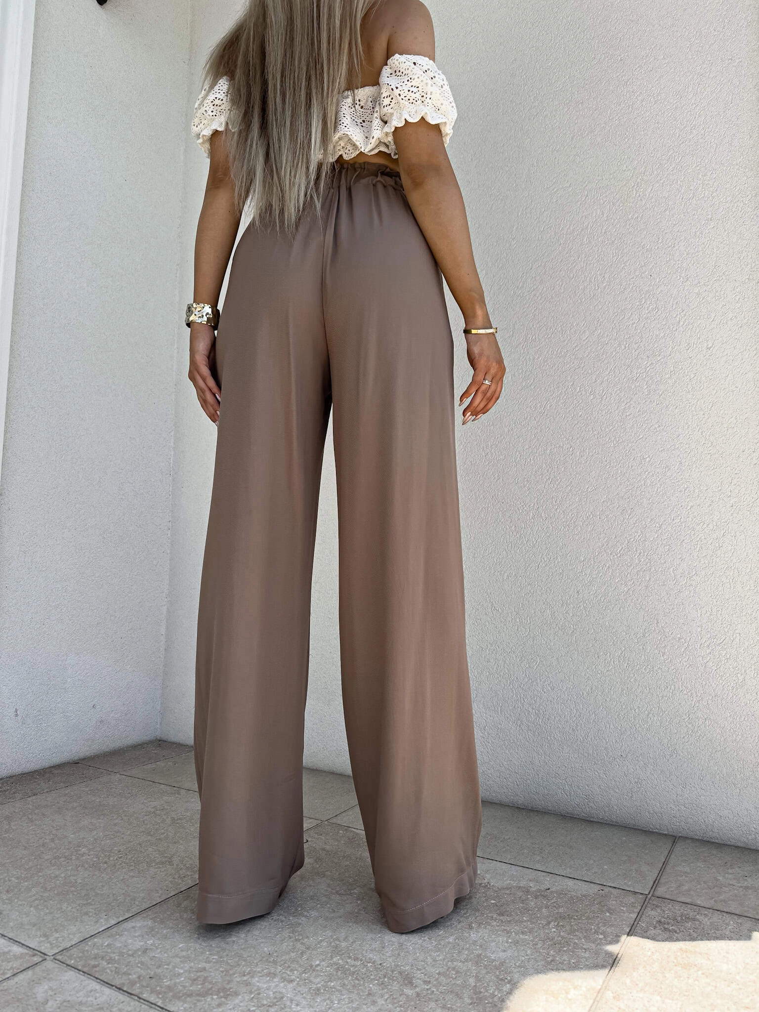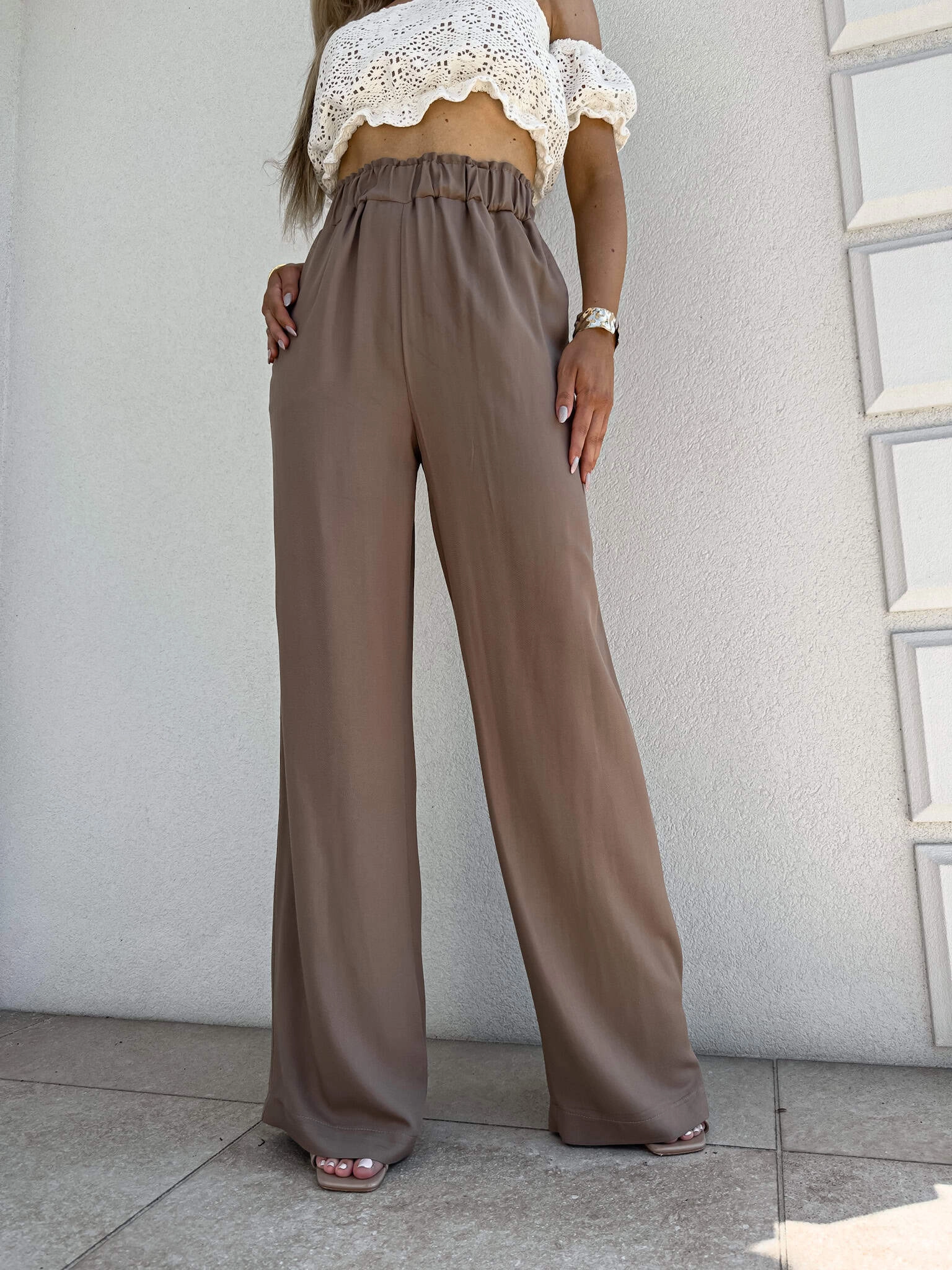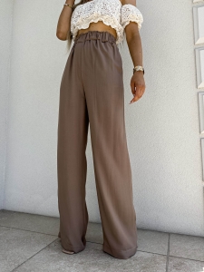 LUJO mokka zwiewne spodnie z szeroką nogawką i gumką w pasie