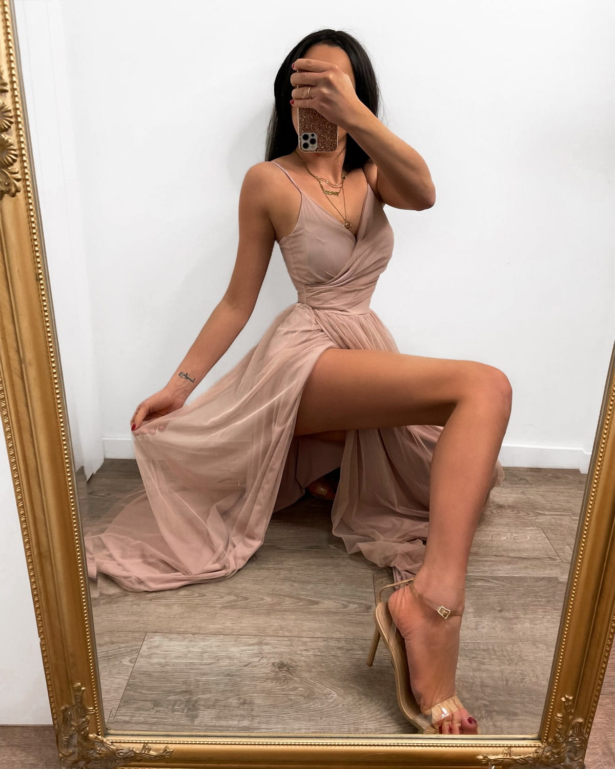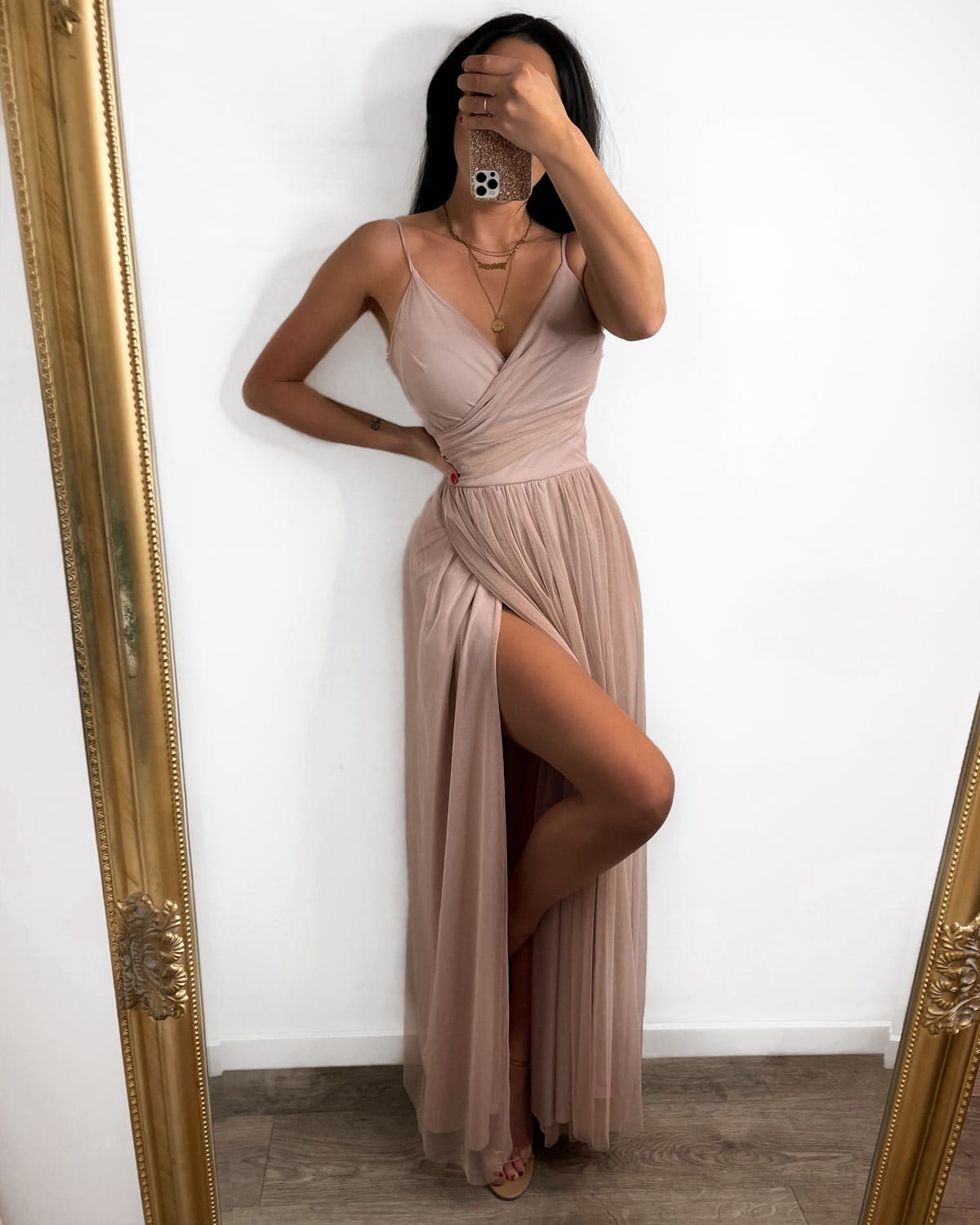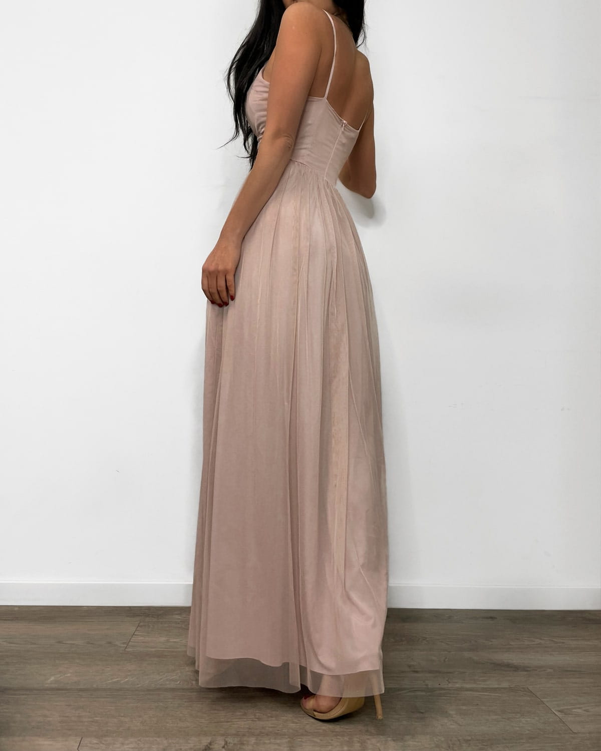 LUV SPELL pudrowa różowa tiulowa sukienka maxi z rozcięciem