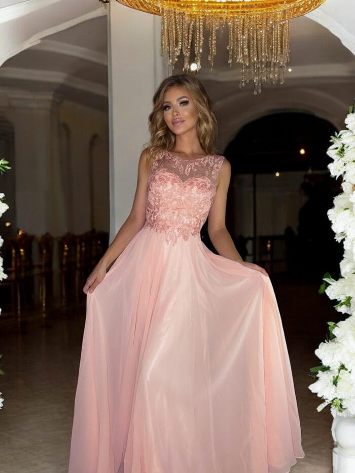 Pudrowo różowa sukienka maxi z koronką z przodu – idealna na wesele