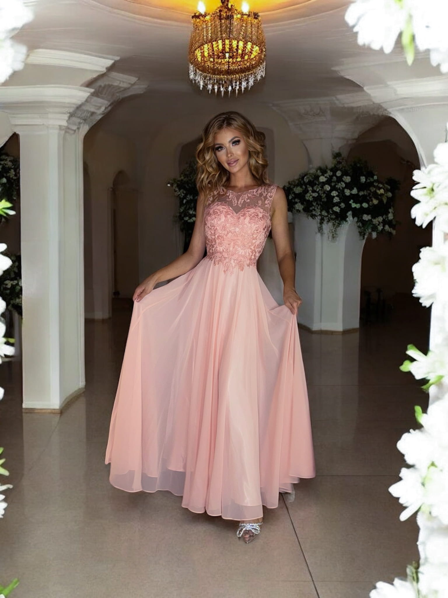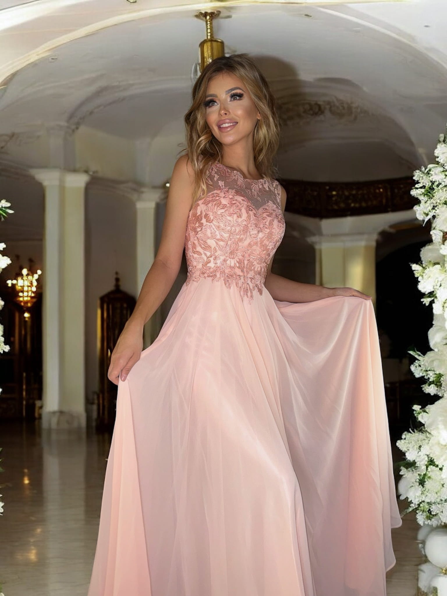Ta pudrowo różowa sukienka maxi to doskonały wybór na wesele, łączący w sobie subtelną elegancję i romantyczny styl. Górna część sukienki ozdobiona jest delikatną koronką z przodu, która dodaje całości kobiecego uroku i finezji. Koronkowe detale podkreślają wyjątkowość kreacji, nadając jej szykownego charakteru.