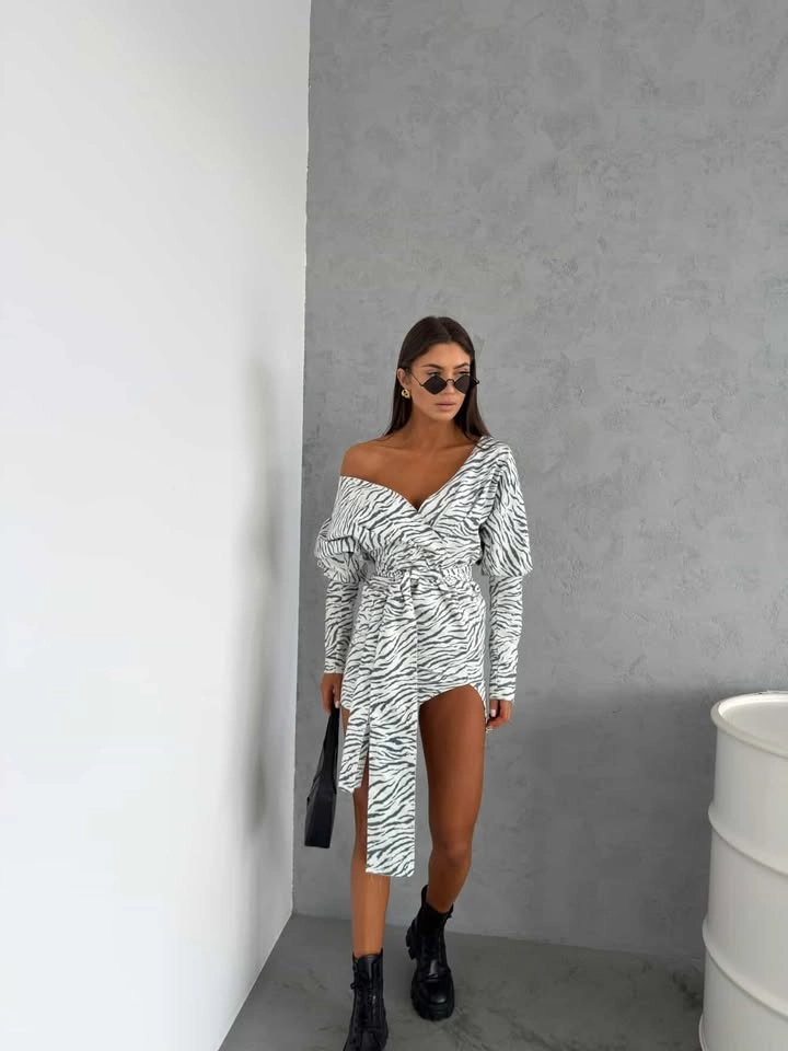 To elegancka sukienka mini na wyjątkowe okazje, która sprawdzi się zarówno podczas spotkań, randek, jak i bardziej stylowych wyjść. Czarny print zebry na jasnym tle nadaje całości charakteru i przyciąga uwagę, jednocześnie zachowując elegancki balans między klasyką a trendem.