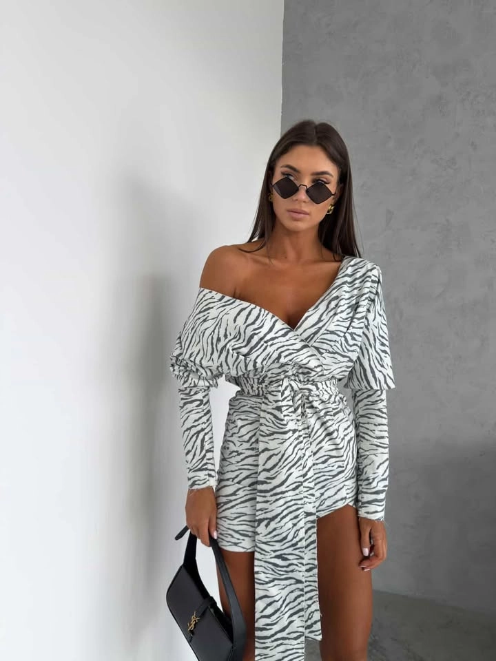 biała sukienka mini, sukienka w czarną zebrę, sukienka zebra print, sukienka biało czarna elegancka, sukienka na randkę, sukienka na imprezę, sukienka na kolację, sukienka na wieczorne wyjście, sukienka wizytowa, sukienka na rodzinne spotkania, sukienka kopertowa, sukienka z paskiem w talii, sukienka z długim rękawem, sukienka modelująca sylwetkę, stylowa sukienka damska, elegancka sukienka mini, sukienka na event, sukienka na cocktail, modna sukienka damska, sukienka na specjalne okazje