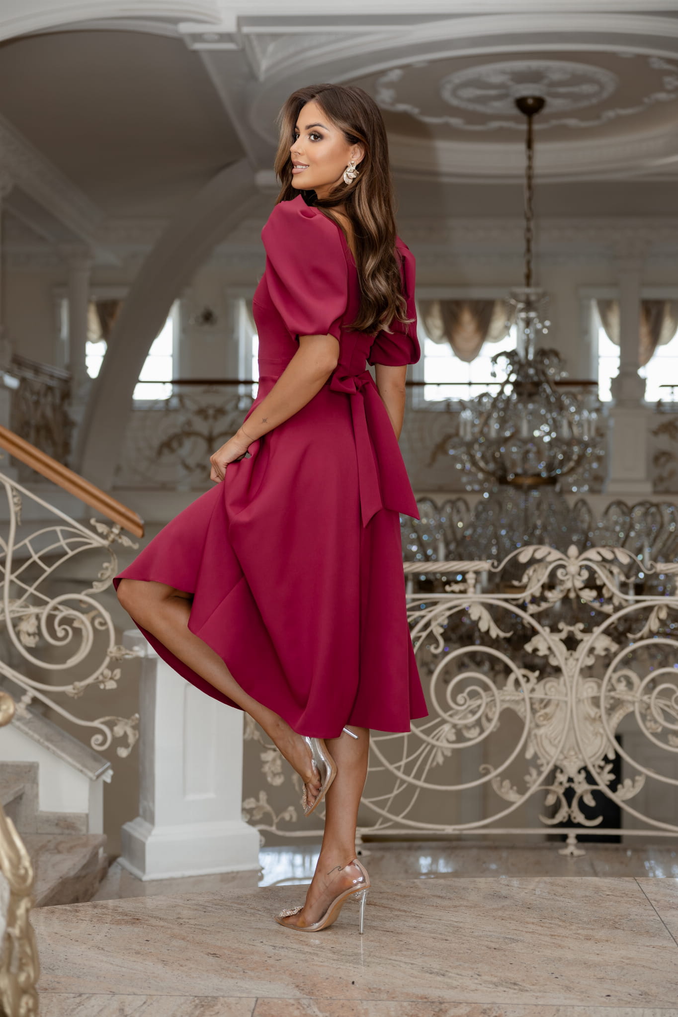 SHEILA midi bordowa elegancka sukienka z rękawkiem i kokardą
