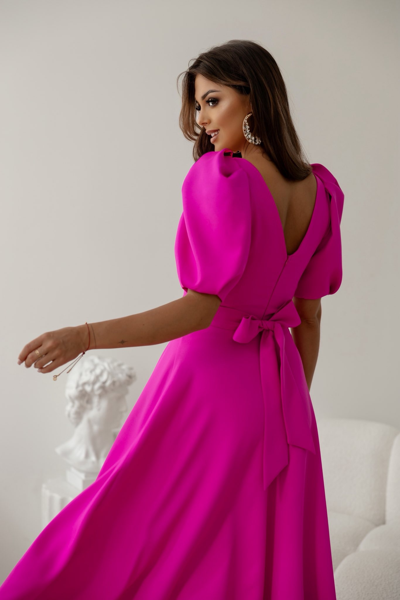SHEILA midi fuksja elegancka sukienka z rękawem i kokardą