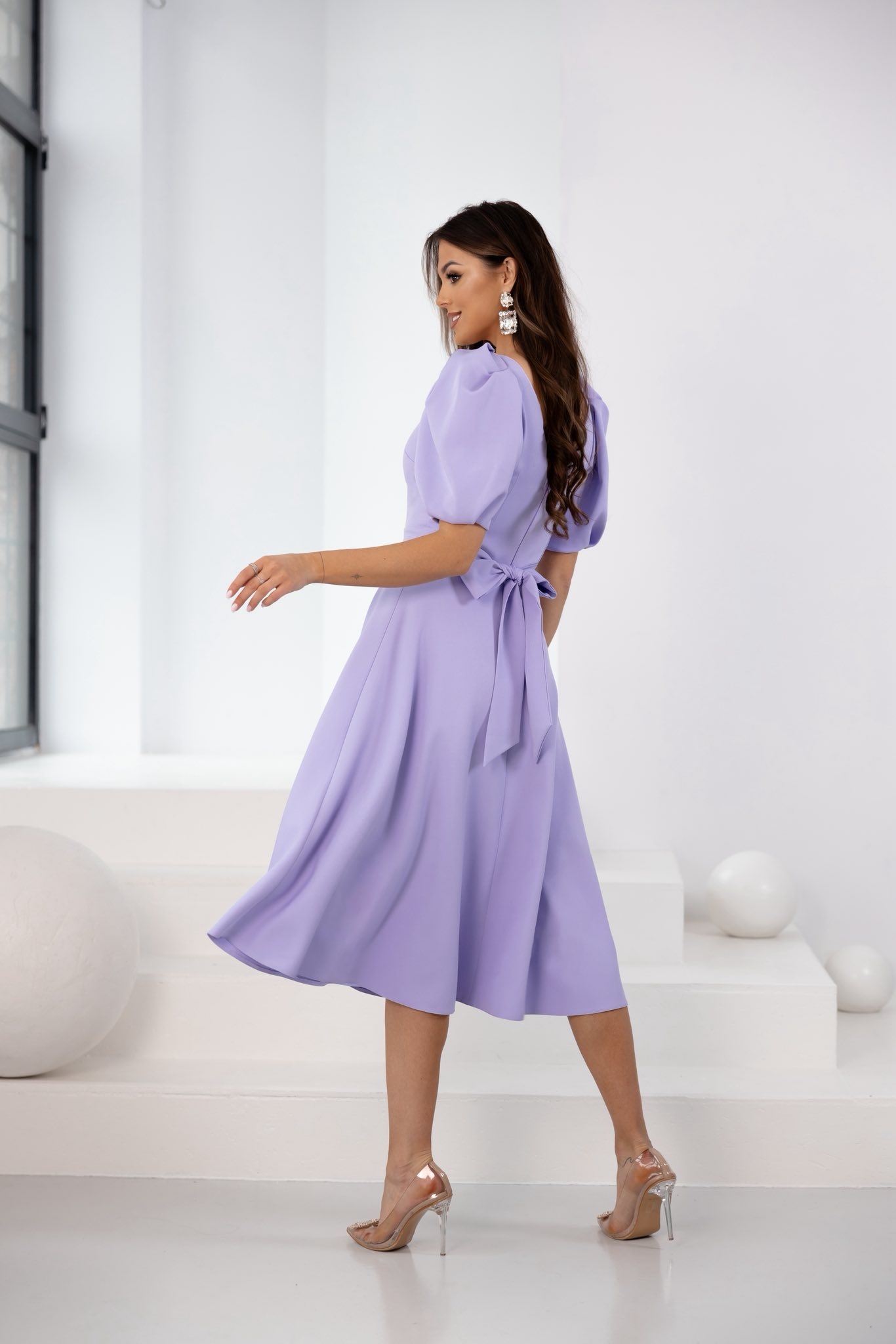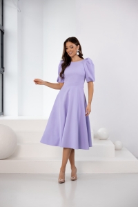 SHEILA midi liliowa elegancka sukienka z rękawem i kokardą