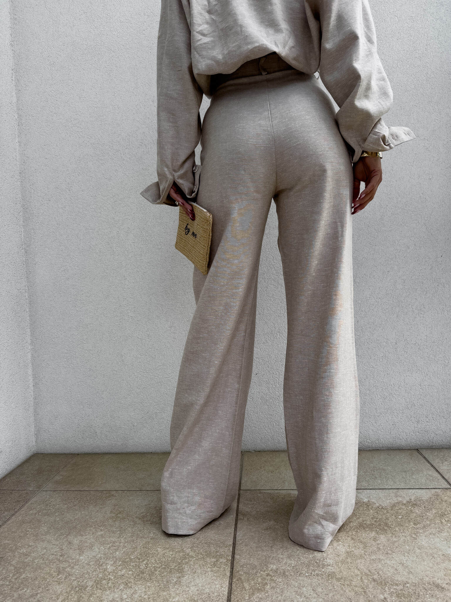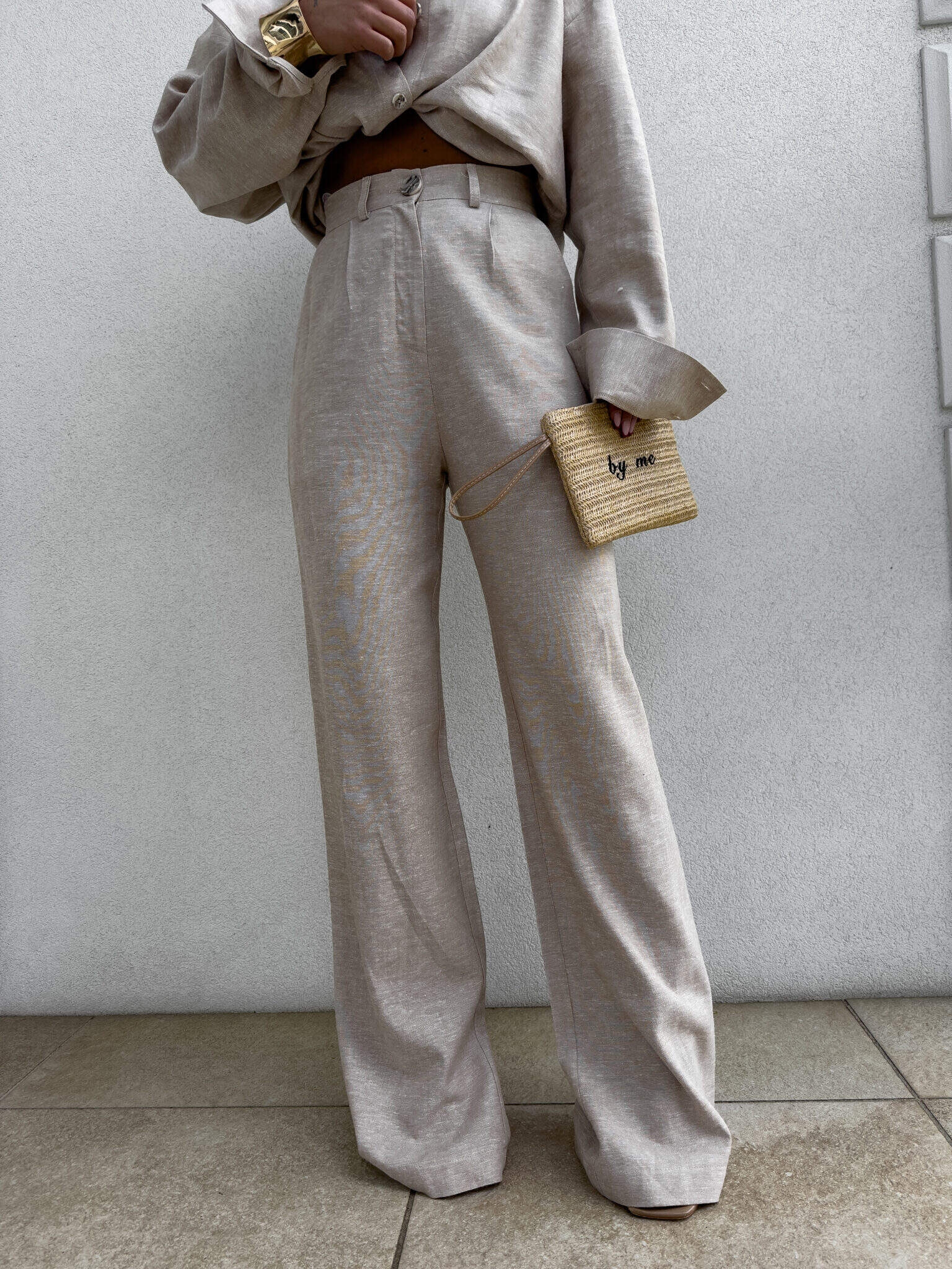 Naturalny materiał z dodatkiem lnu zapewnia przewiewność i komfort noszenia, idealny szczególnie na cieplejsze dni. Delikatnie surowa struktura tkaniny podkreśla ich naturalny charakter.