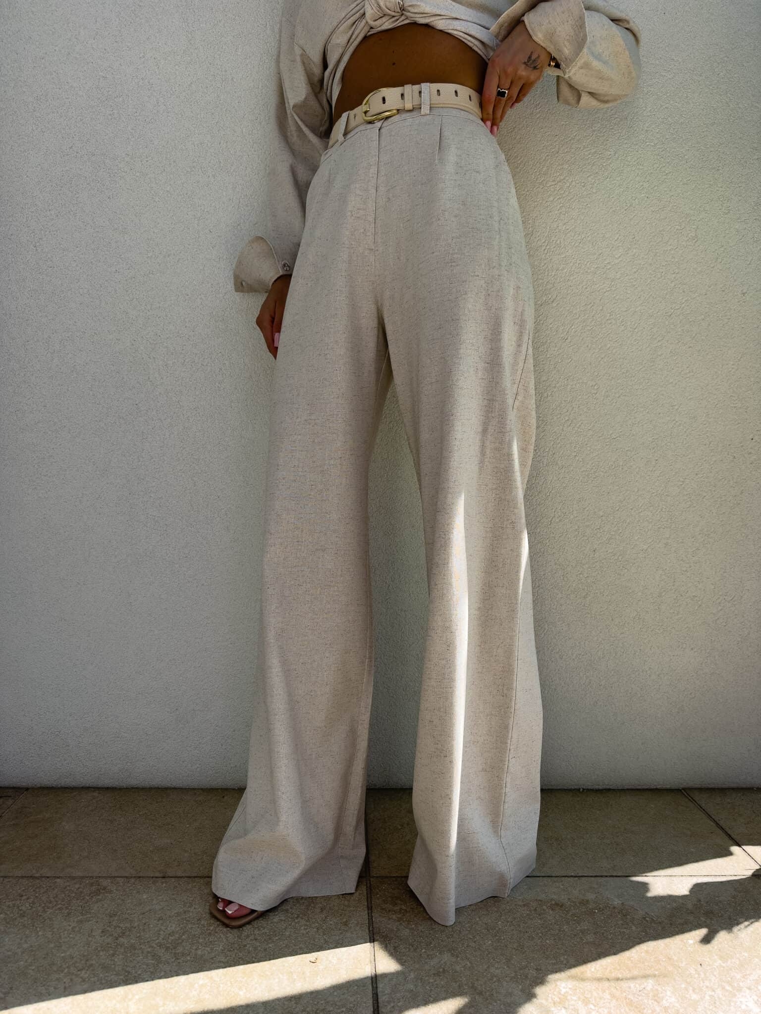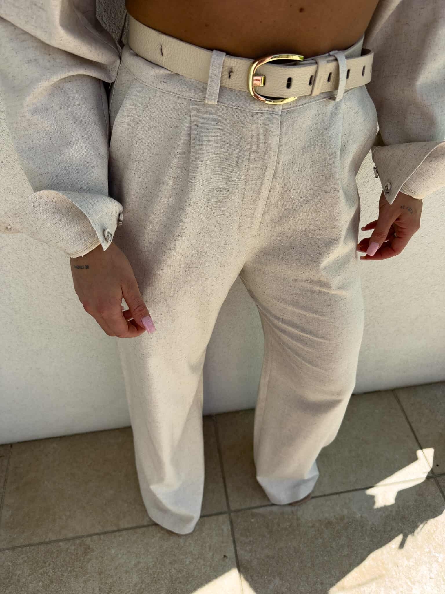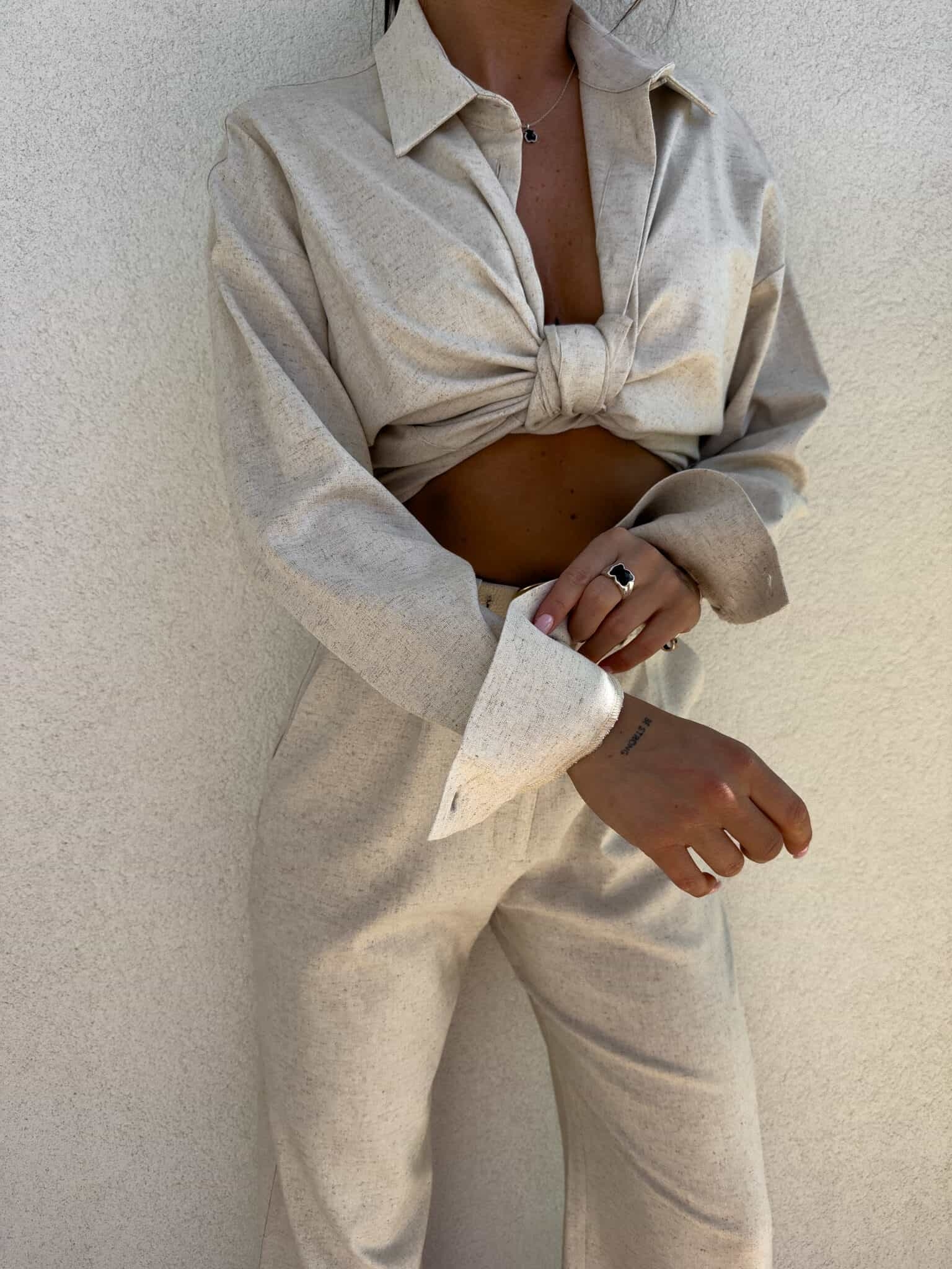 Naturalny materiał z dodatkiem lnu zapewnia przewiewność i komfort noszenia, idealny szczególnie na cieplejsze dni. Delikatnie surowa struktura tkaniny podkreśla ich naturalny charakter.
