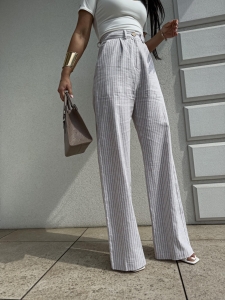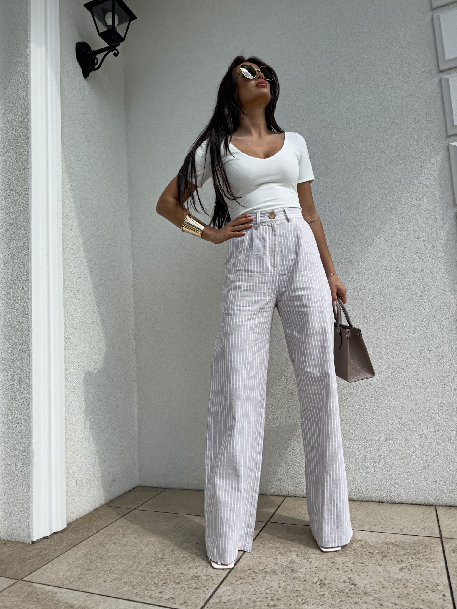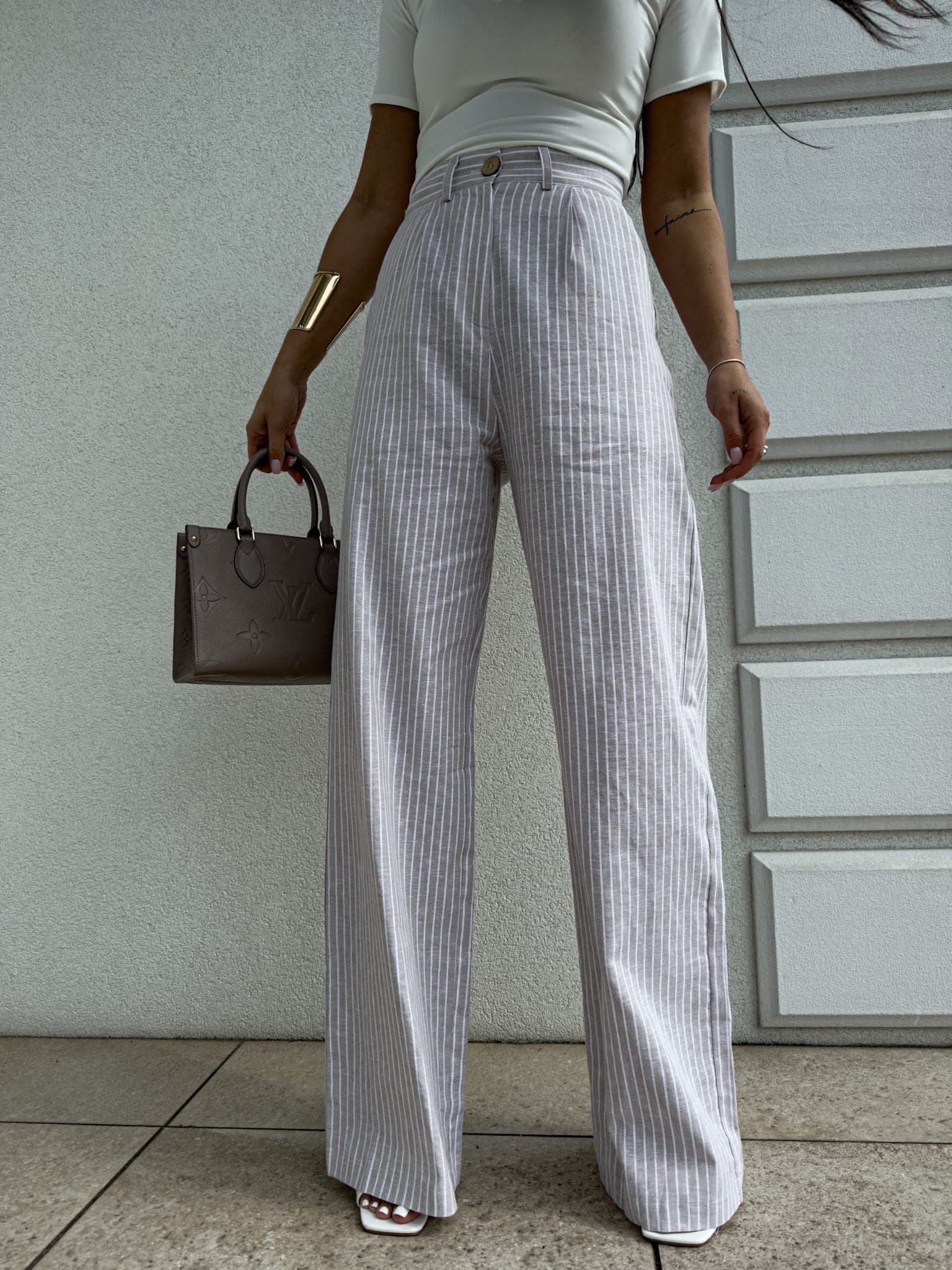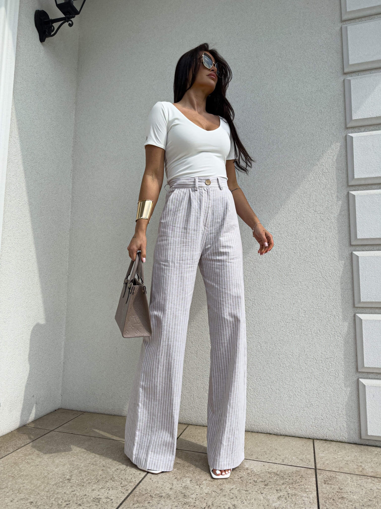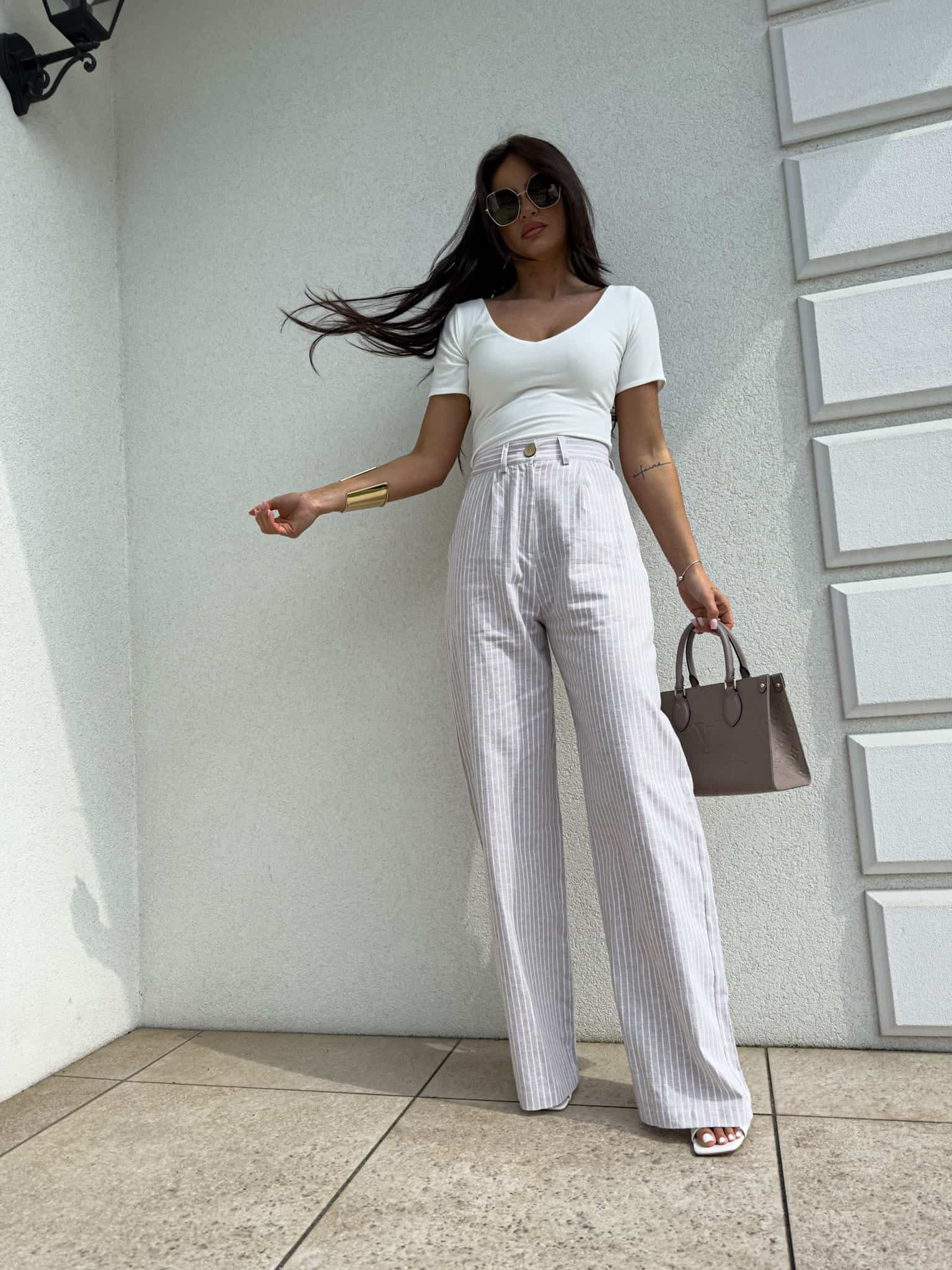 Dopracowany krój idealnie układa się na ciele, podkreślając talię i eksponując linię bioder. Wysoki stan pięknie modeluje proporcje, a prosta nogawka optycznie wydłuża nogi, nadając sylwetce lekkości i elegancji. Spodnie zapinane są na guzik i posiadają praktyczne szlufki, dzięki czemu możesz stylizować je również z paskiem.