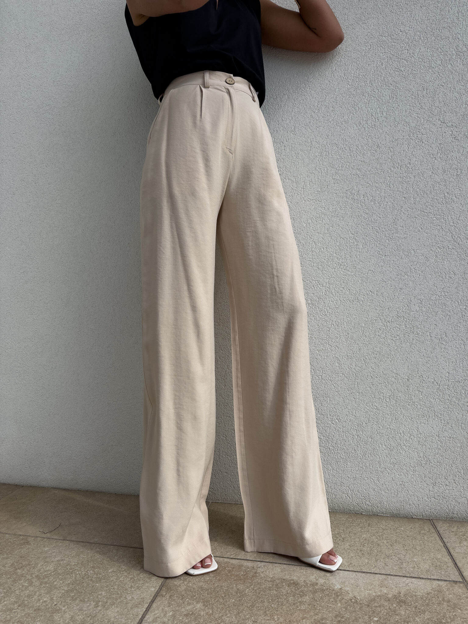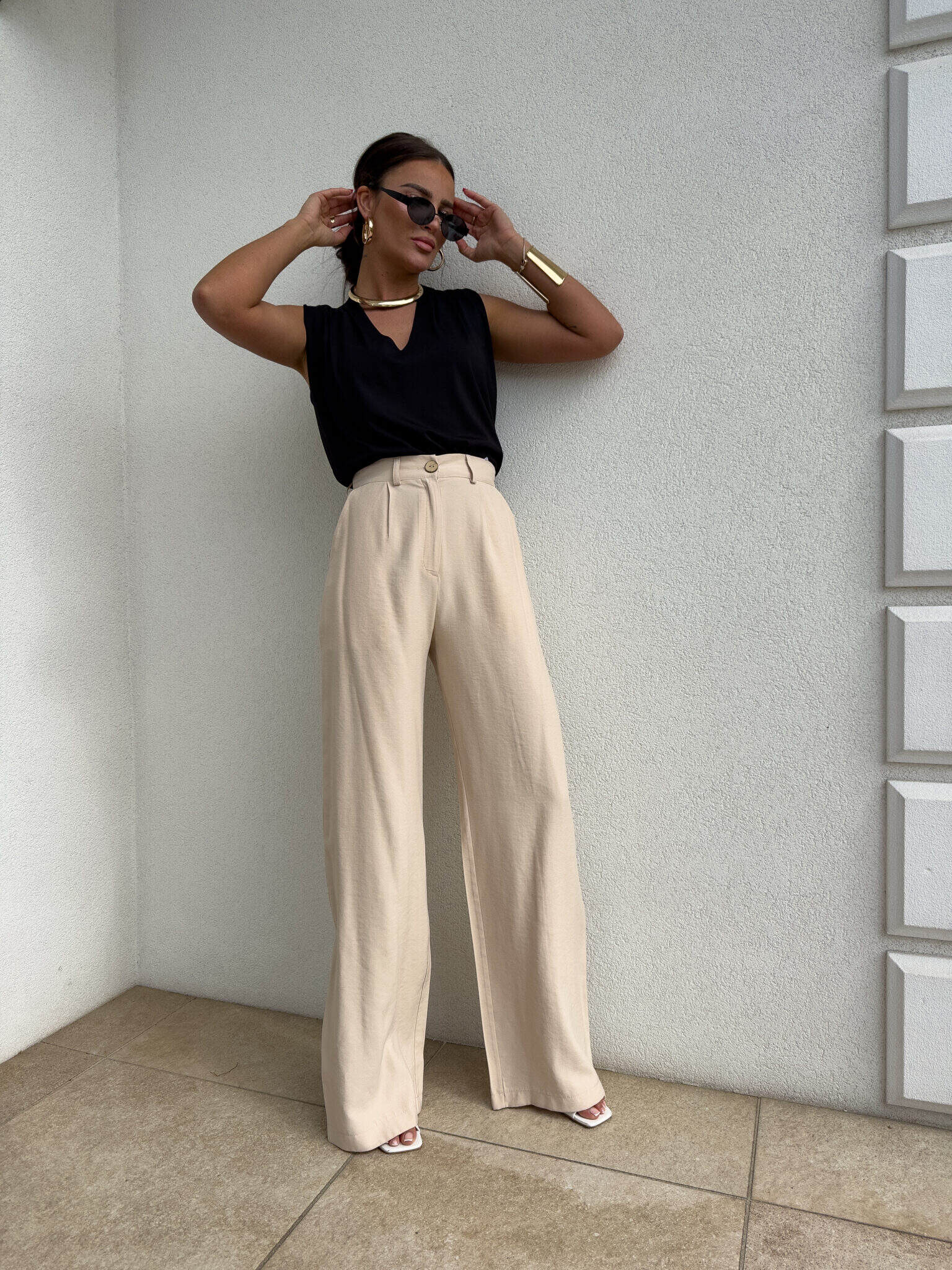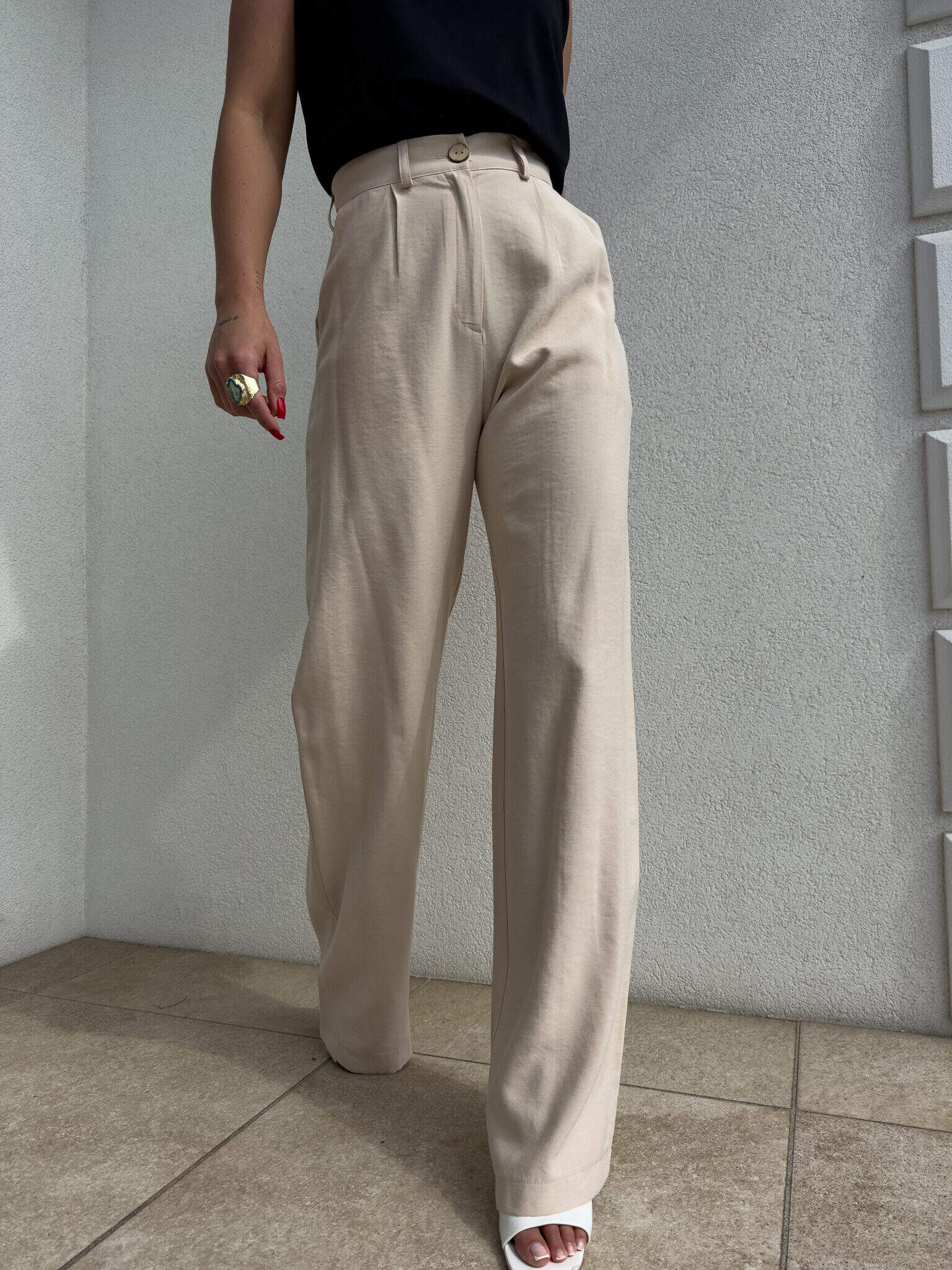 Dopracowany krój idealnie układa się na ciele, podkreślając talię i eksponując linię bioder. Wysoki stan pięknie modeluje proporcje, a prosta nogawka optycznie wydłuża nogi, nadając sylwetce lekkości i elegancji. Spodnie zapinane są na guzik i posiadają praktyczne szlufki, dzięki czemu możesz stylizować je również z paskiem.