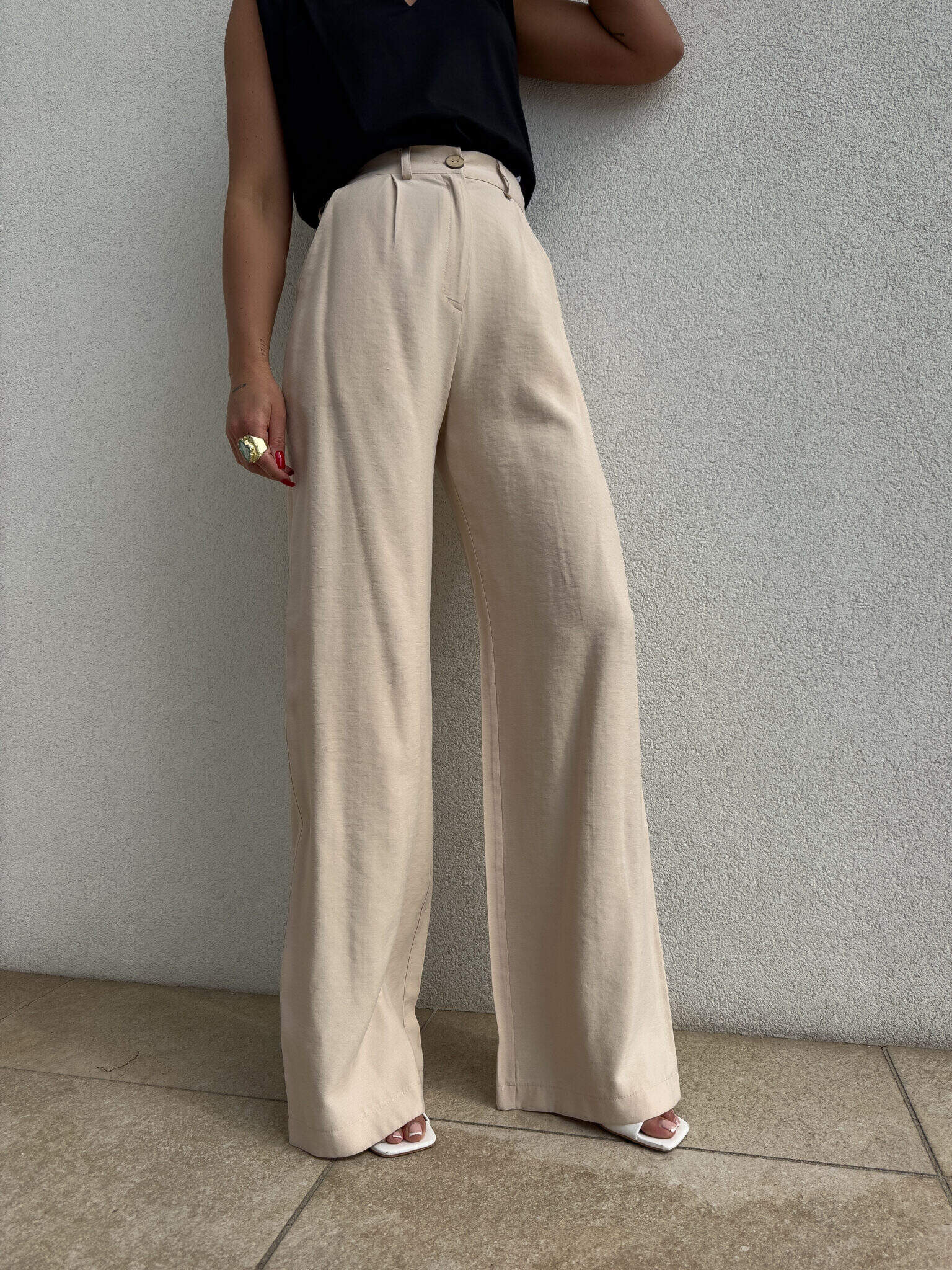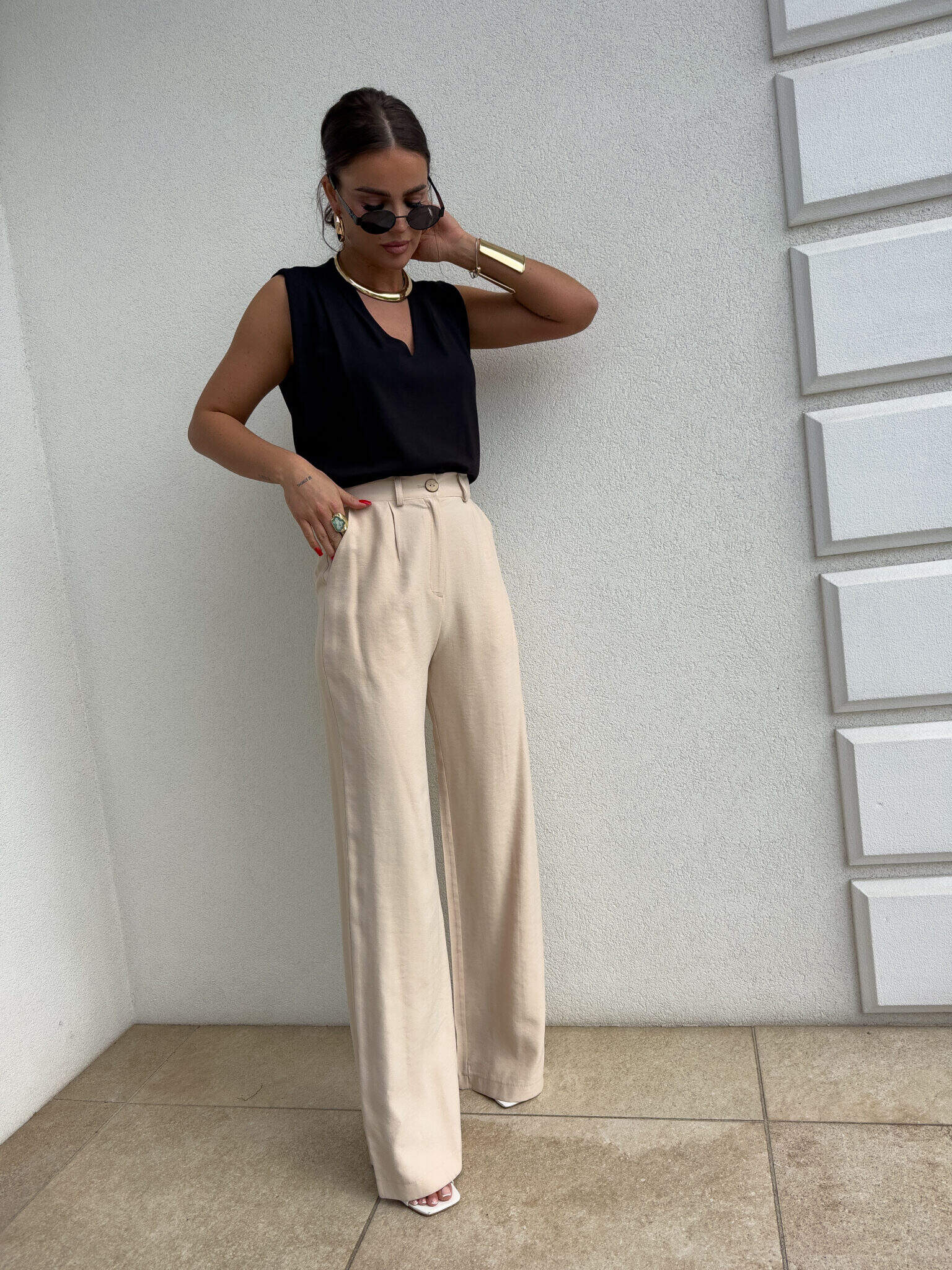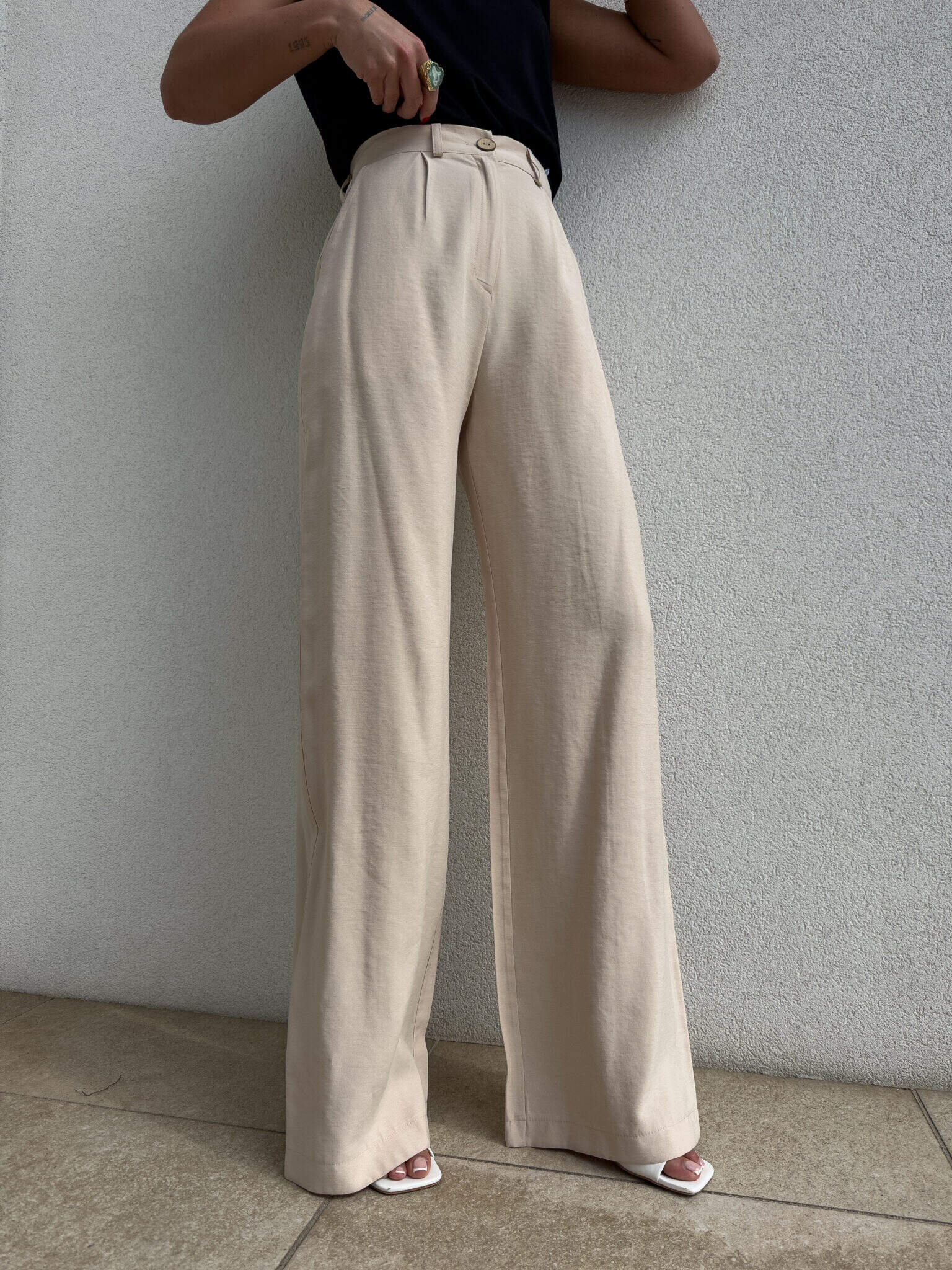 Dopracowany krój idealnie układa się na ciele, podkreślając talię i eksponując linię bioder. Wysoki stan pięknie modeluje proporcje, a prosta nogawka optycznie wydłuża nogi, nadając sylwetce lekkości i elegancji. Spodnie zapinane są na guzik i posiadają praktyczne szlufki, dzięki czemu możesz stylizować je również z paskiem.