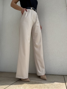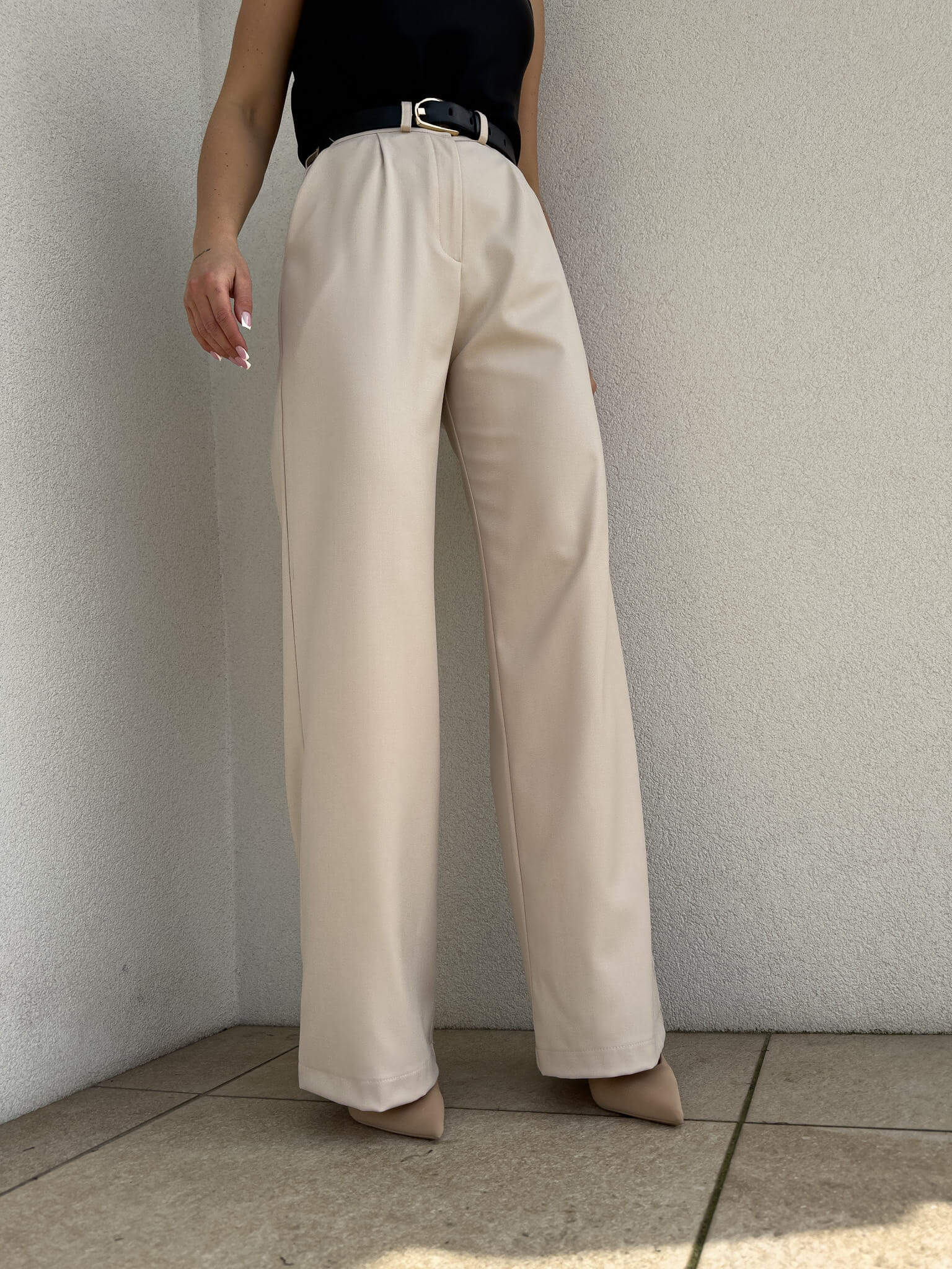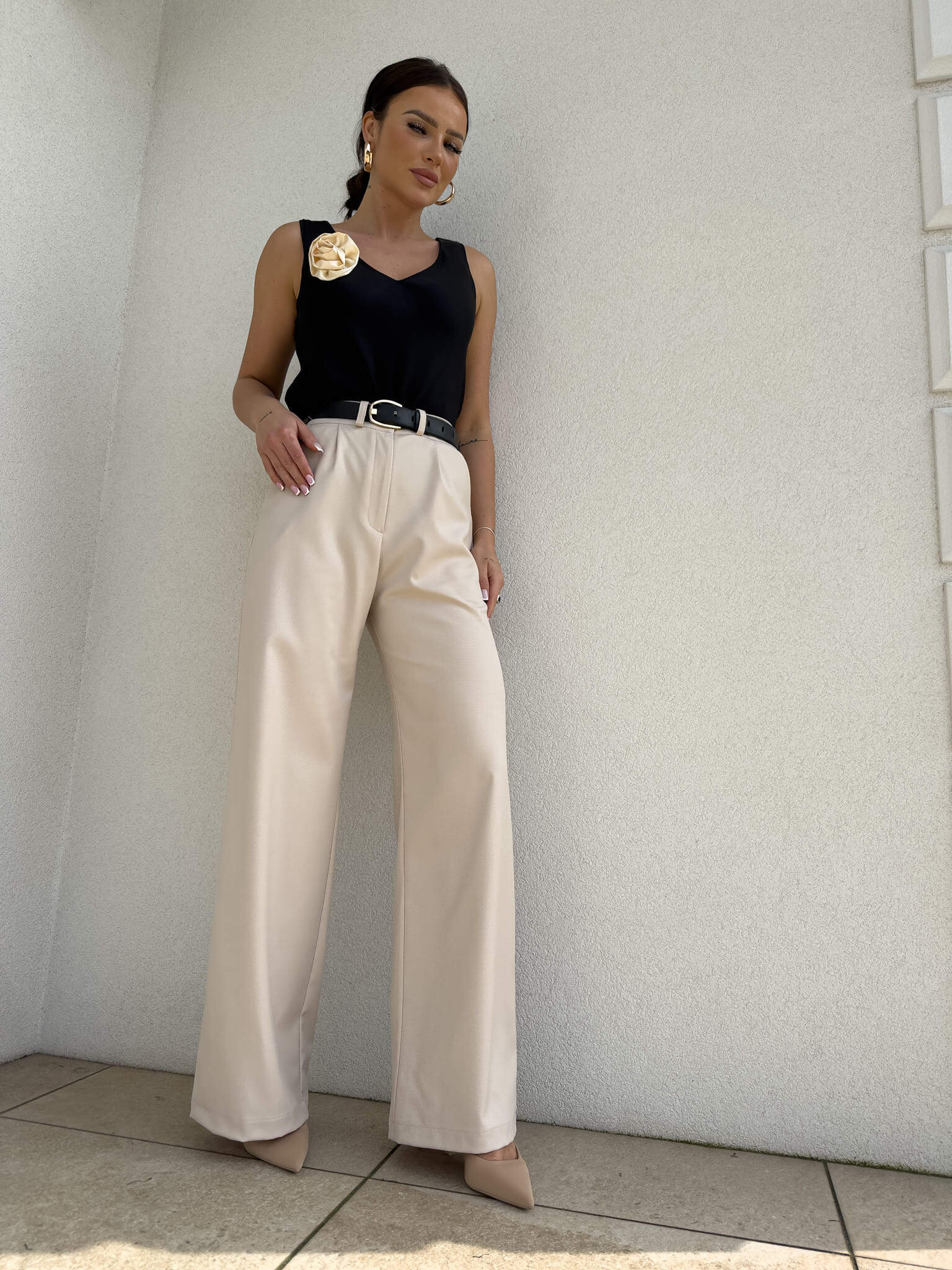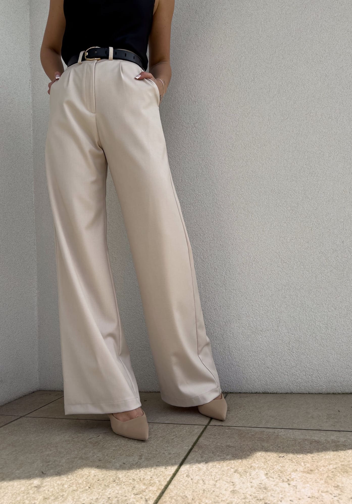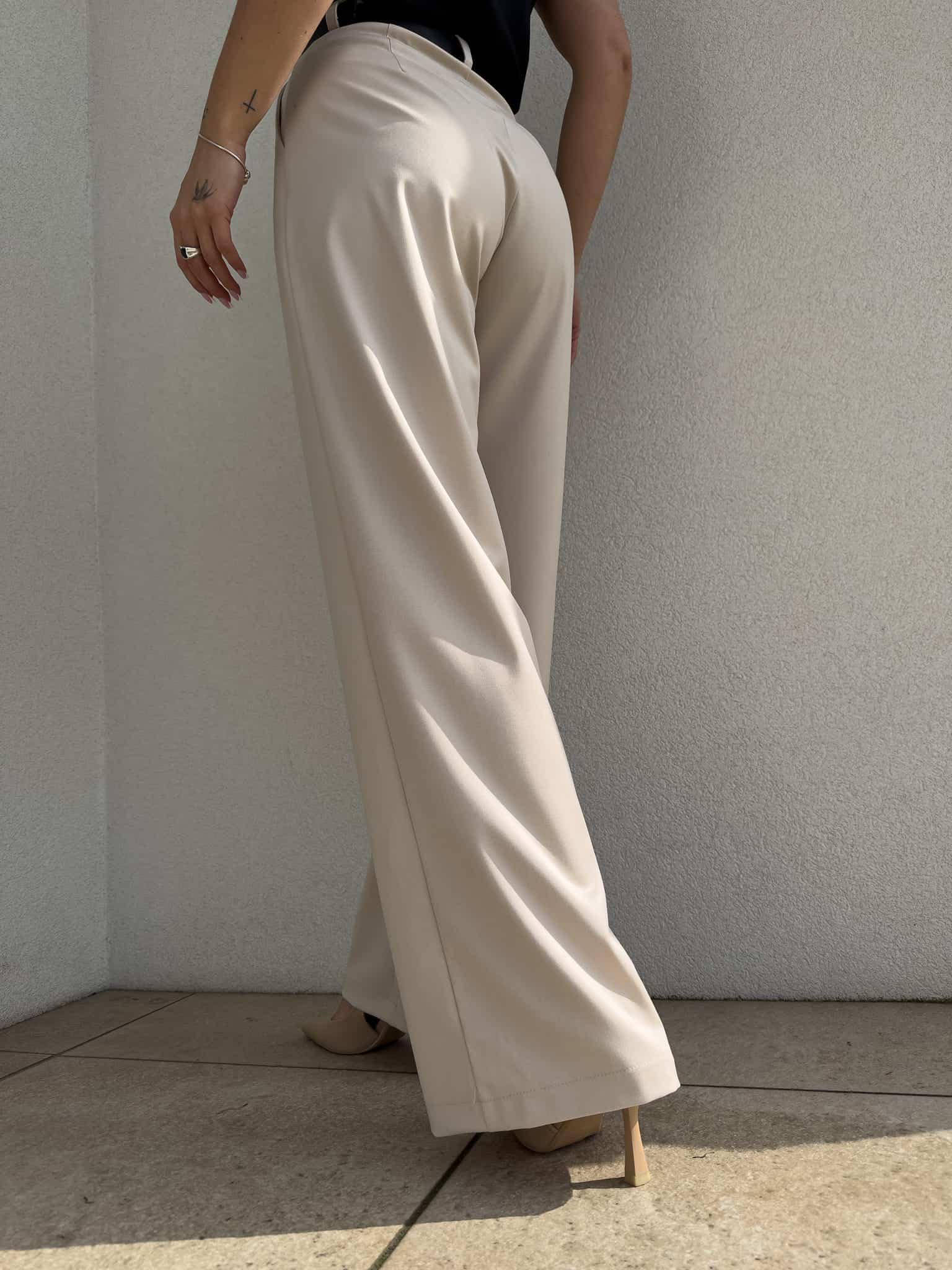 Dopracowany krój idealnie układa się na ciele, podkreślając talię i eksponując linię bioder. Wysoki stan pięknie modeluje proporcje, a prosta nogawka optycznie wydłuża nogi, nadając sylwetce lekkości i elegancji. Spodnie zapinane są na guzik i posiadają praktyczne szlufki, dzięki czemu możesz stylizować je również z paskiem.