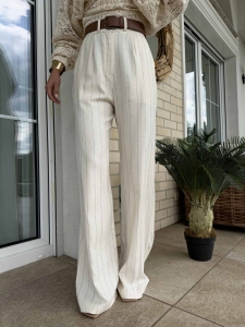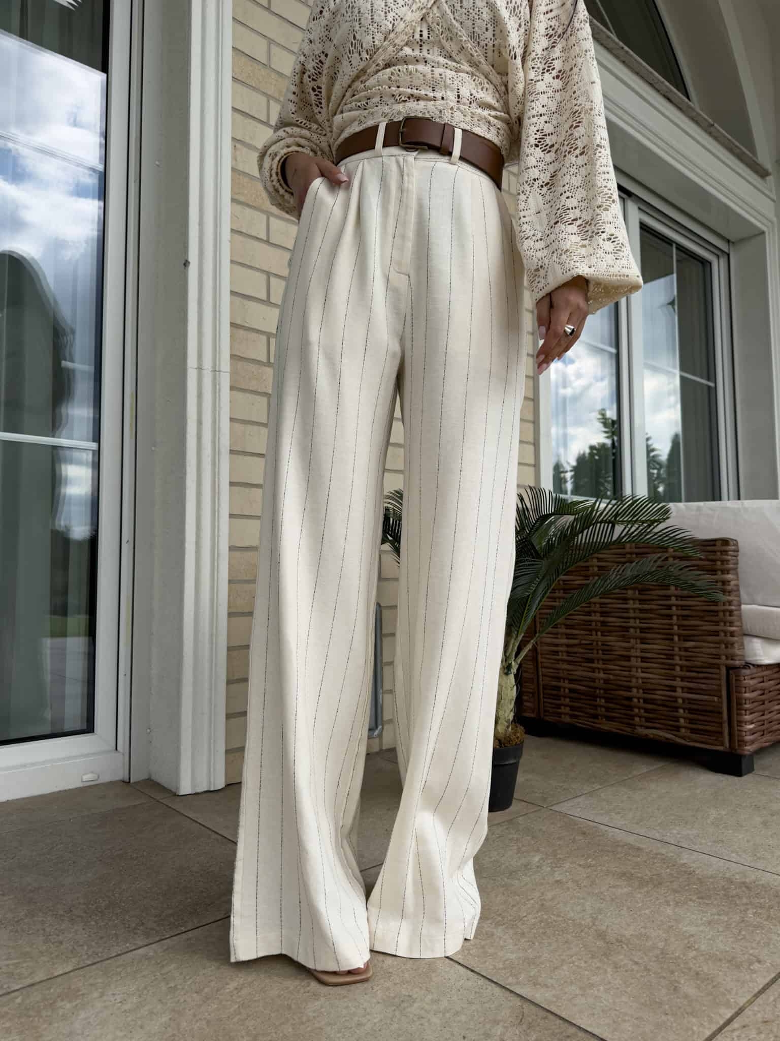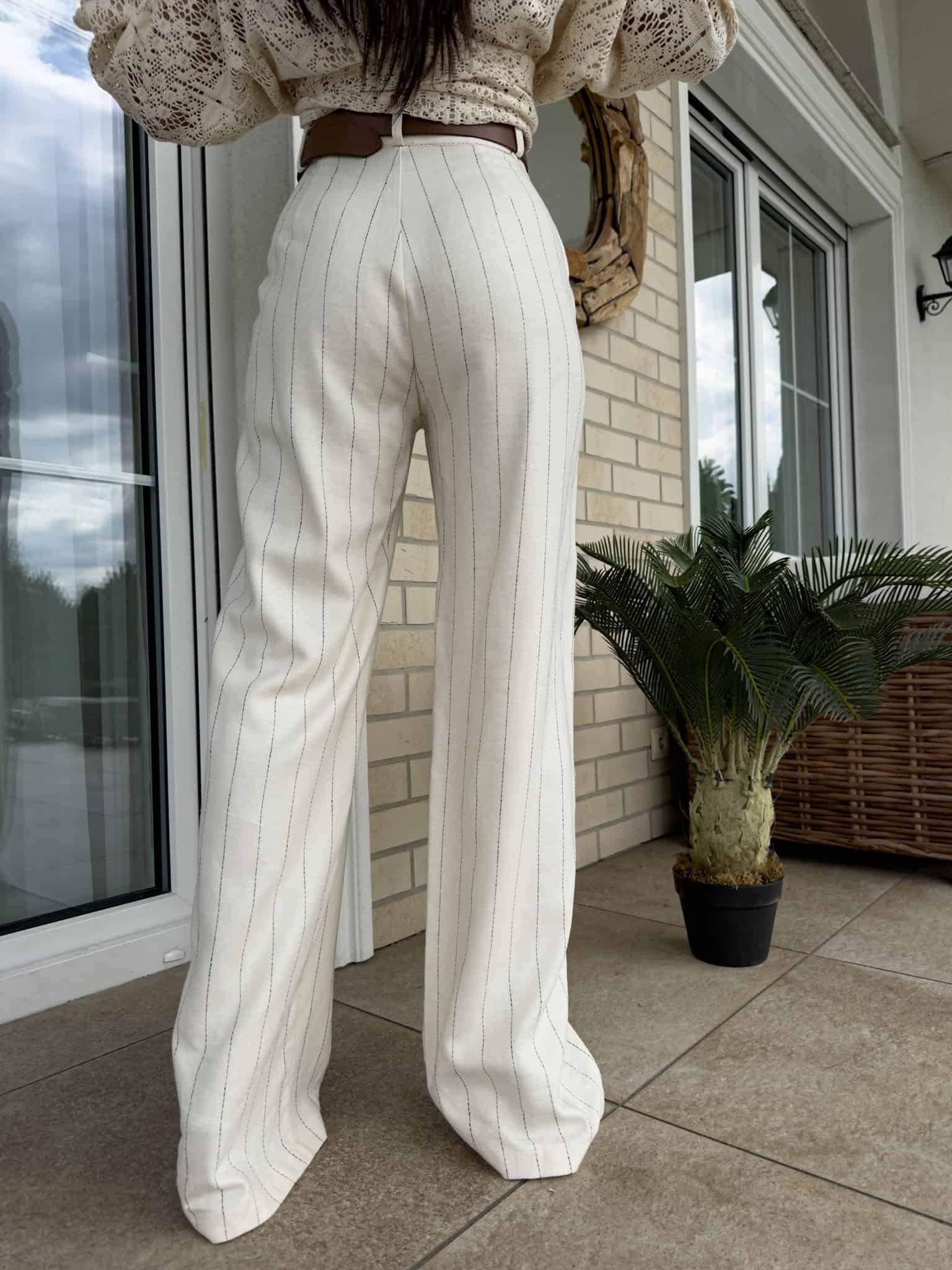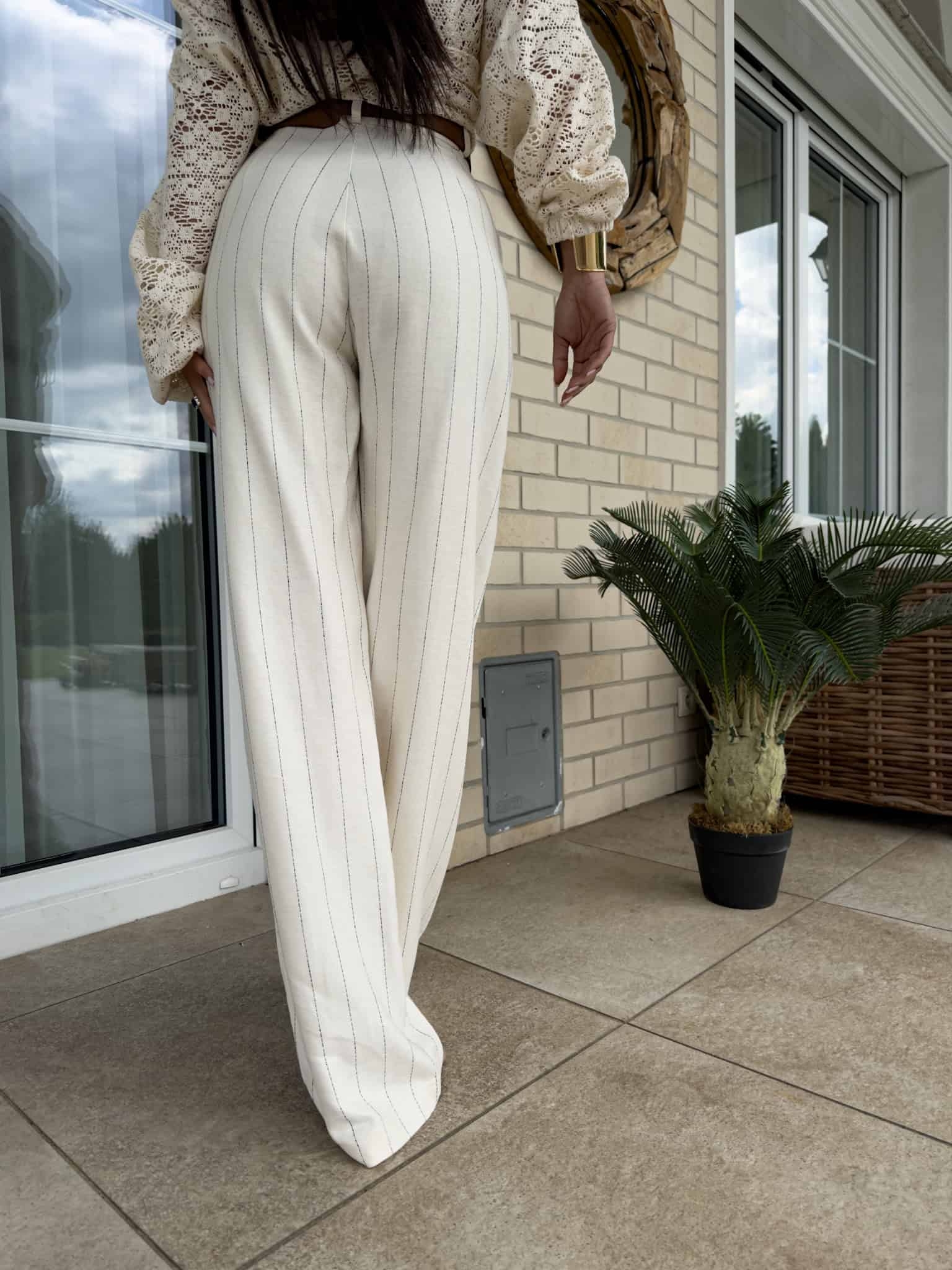 Dopracowany krój idealnie układa się na ciele, podkreślając talię i eksponując linię bioder. Wysoki stan pięknie modeluje proporcje, a prosta nogawka optycznie wydłuża nogi, nadając sylwetce lekkości i elegancji. Spodnie zapinane są na guzik i posiadają praktyczne szlufki, dzięki czemu możesz stylizować je również z paskiem.