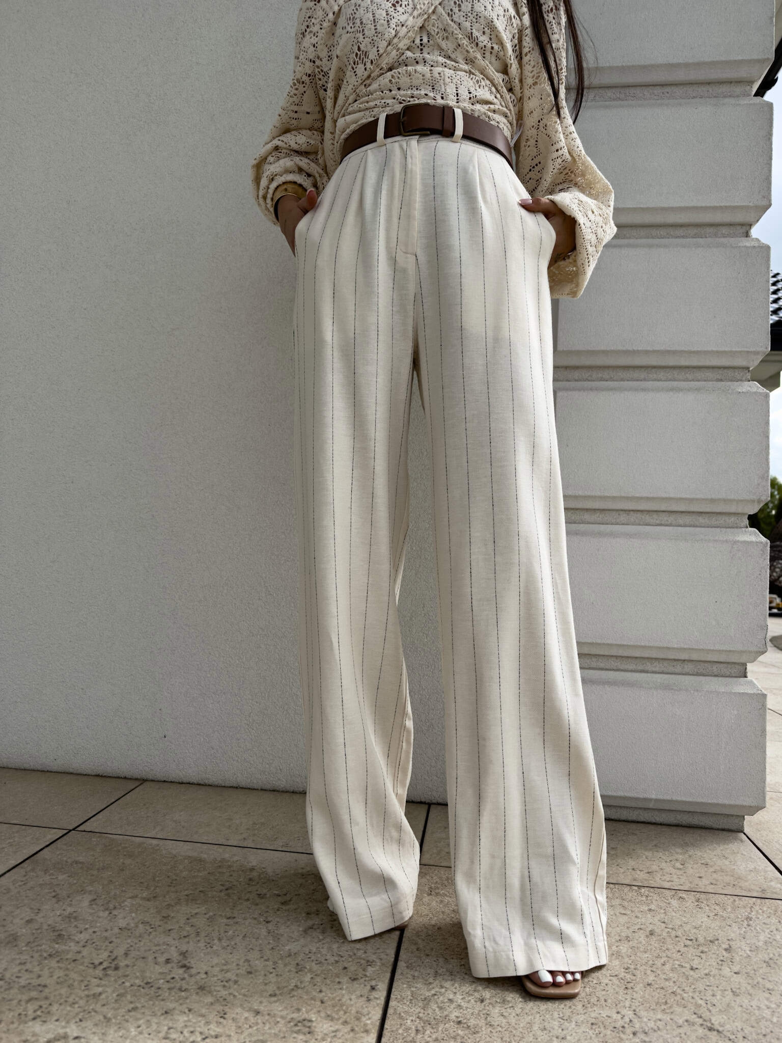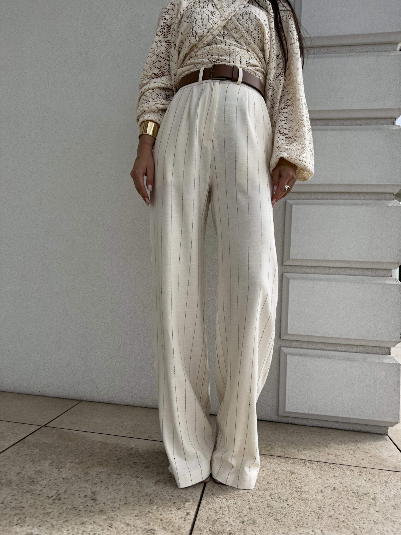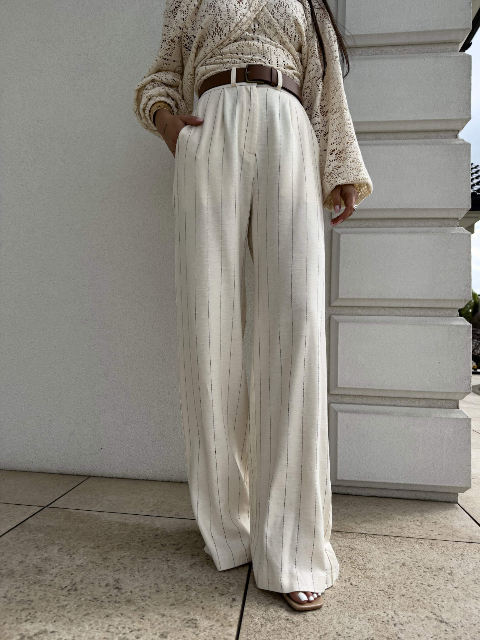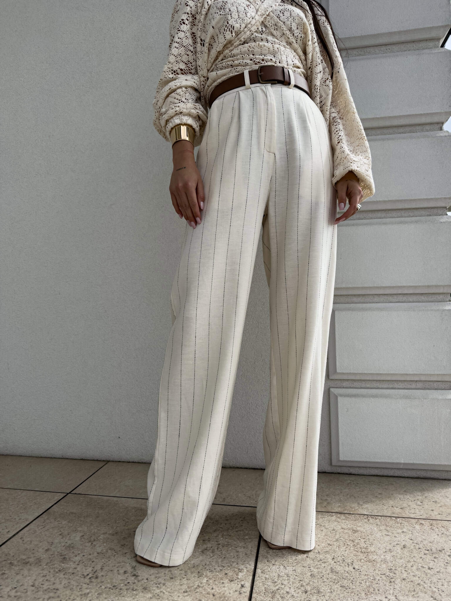 Dopracowany krój idealnie układa się na ciele, podkreślając talię i eksponując linię bioder. Wysoki stan pięknie modeluje proporcje, a prosta nogawka optycznie wydłuża nogi, nadając sylwetce lekkości i elegancji. Spodnie zapinane są na guzik i posiadają praktyczne szlufki, dzięki czemu możesz stylizować je również z paskiem.