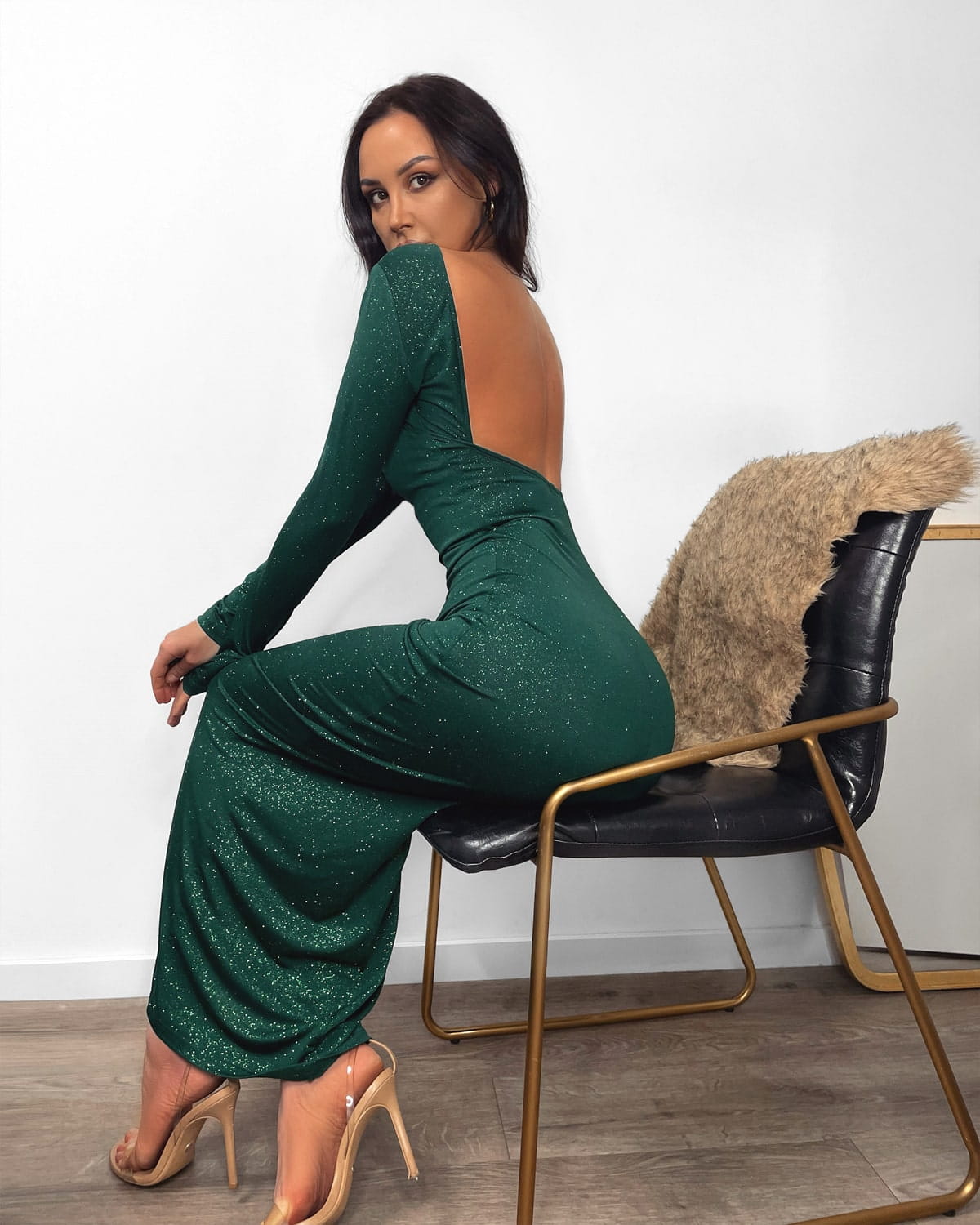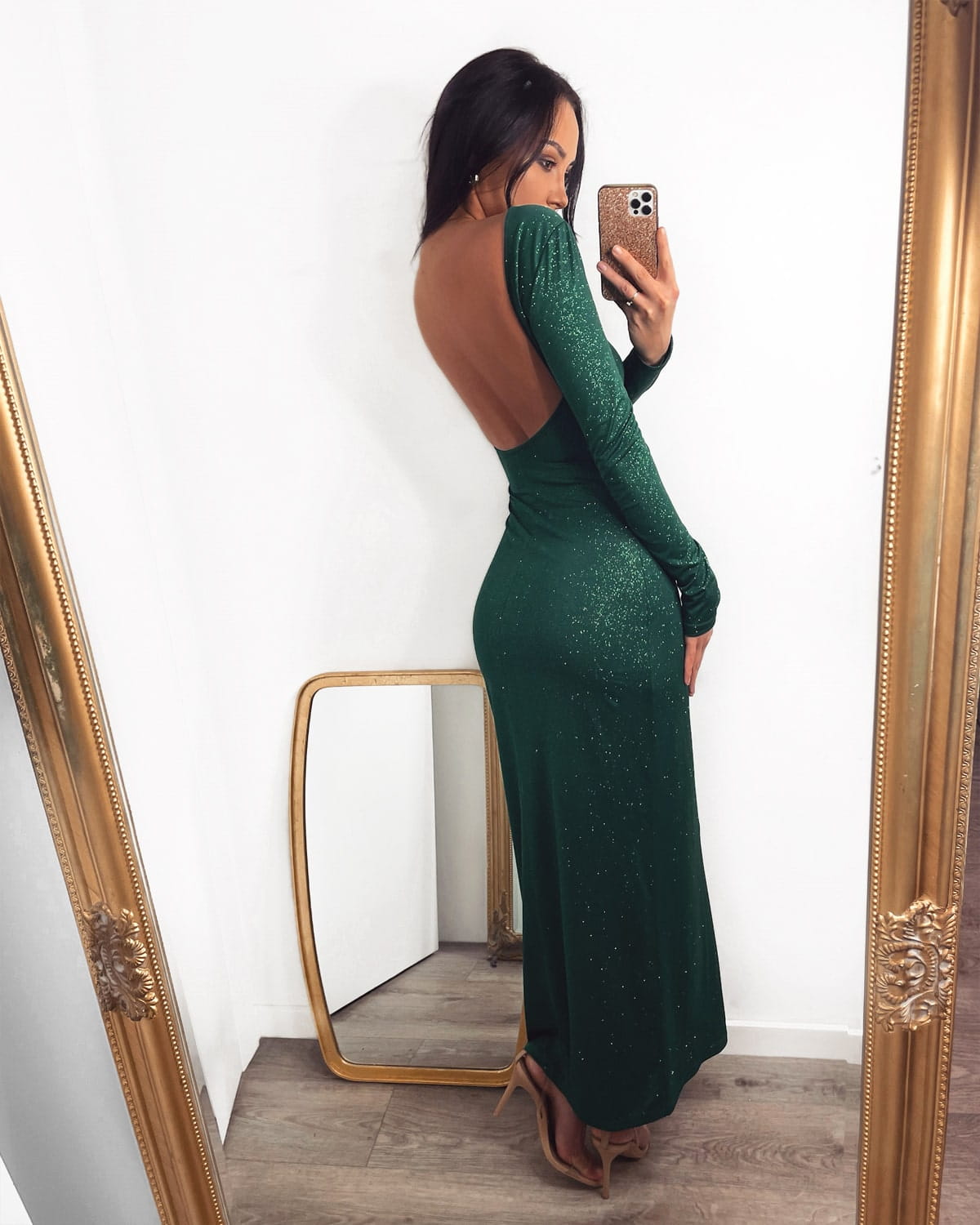 Nasza zielona sukienka maxi to ponadczasowa klasyka. Ma wyjątkowo elegancki fason. Wykonana z brokatowego materiału o głębokim, butelkowym odcieniu zieleni, emanuje niezwykłym urokiem. Sukienka dosłownie opływa ciało, podkreślając figurę w delikatny sposób, a jednocześnie jest przylegający. Długość maxi sprawia, że sukienka jest doskonałym wyborem na wyjątkowe okazje, takie jak wesele, studniówka czy święta. Jej długie rękawy dodają subtelności i sprawiają, że jest idealna również na chłodniejsze wieczory. Głębokie wycięcie na plecach dodaje sukience niepowtarzalnego charakteru.