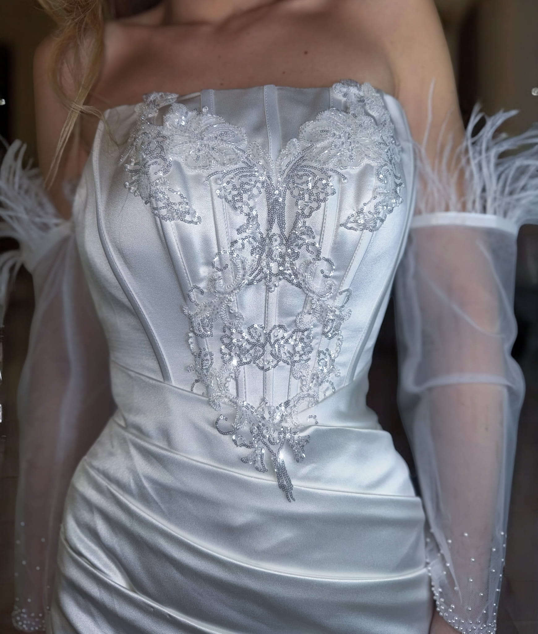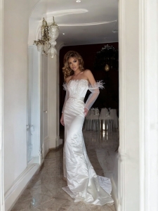 Efektowne rękawki ozdobione piórami na ramionach to luksusowy akcent, który sprawia, że suknia prezentuje się niezwykle wytwornie. Miękka, satynowa tkanina delikatnie opływa sylwetkę, zapewniając komfort i elegancję w najważniejszym dniu.