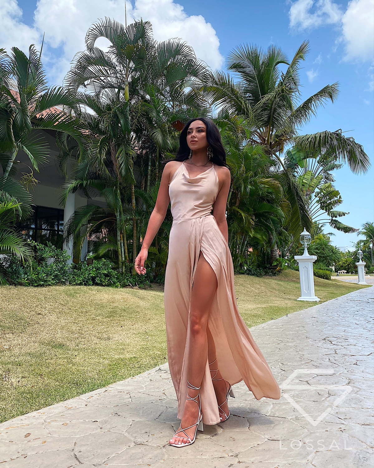 ASTRAL beżowa wieczorowa długa sukienka satynowa
