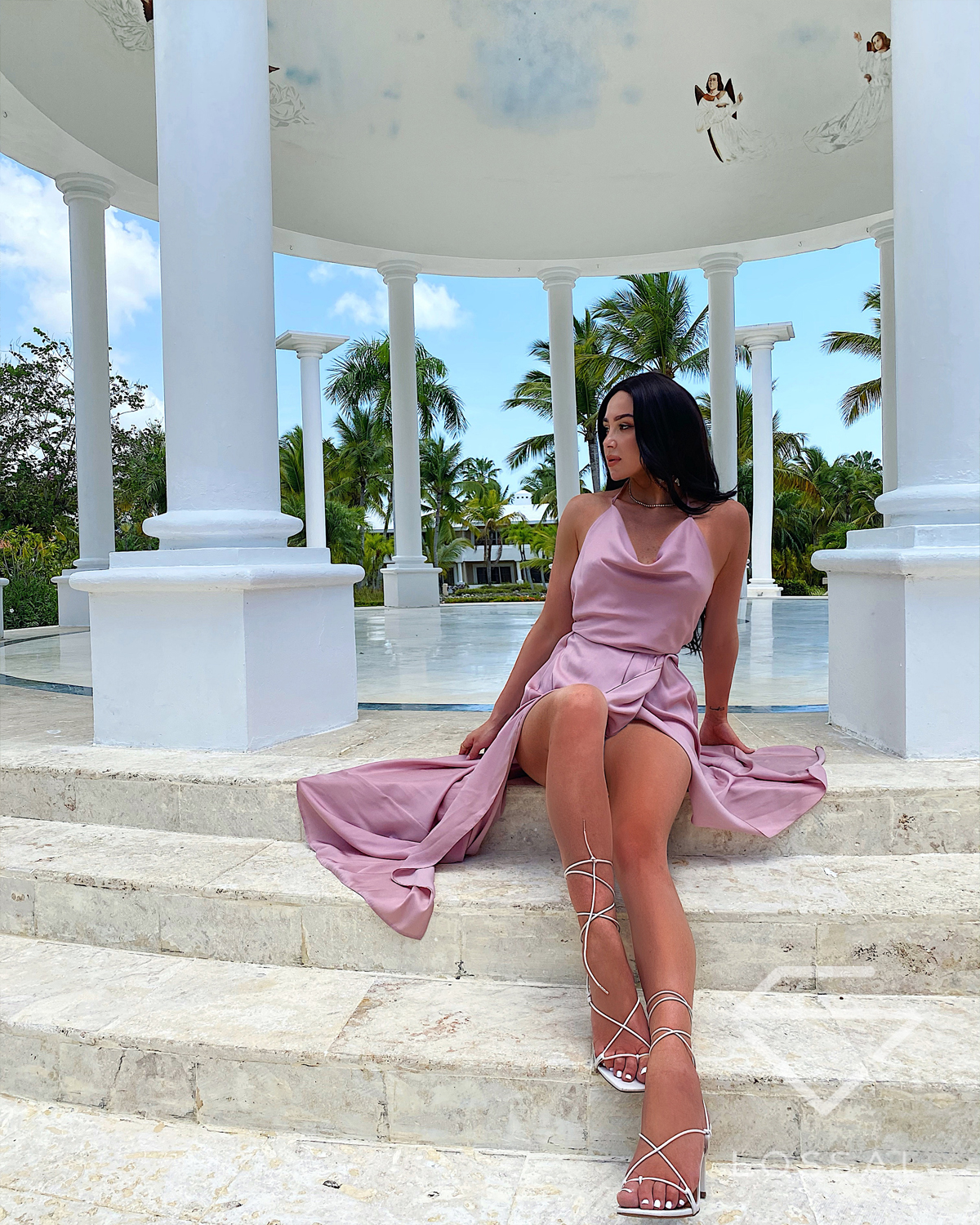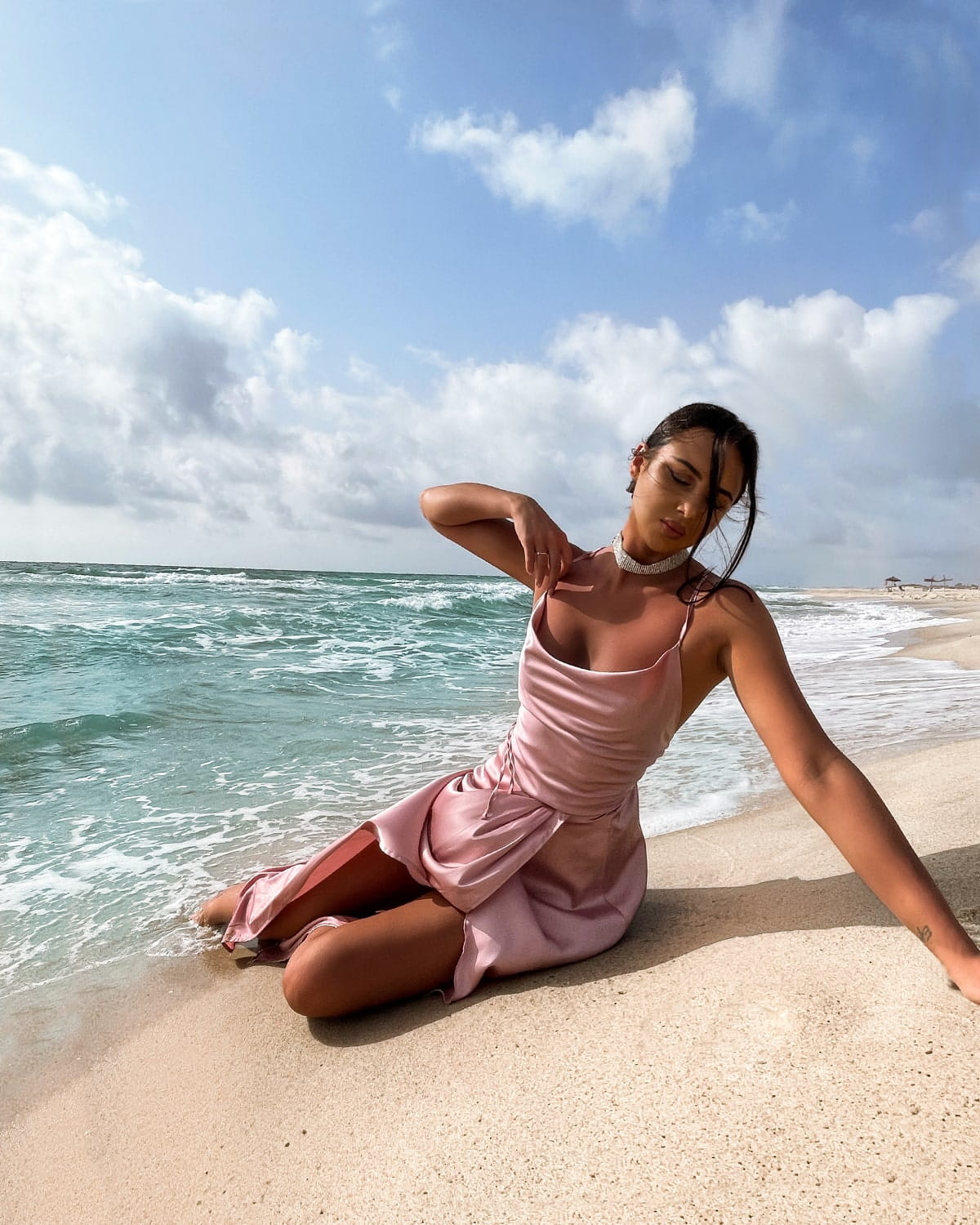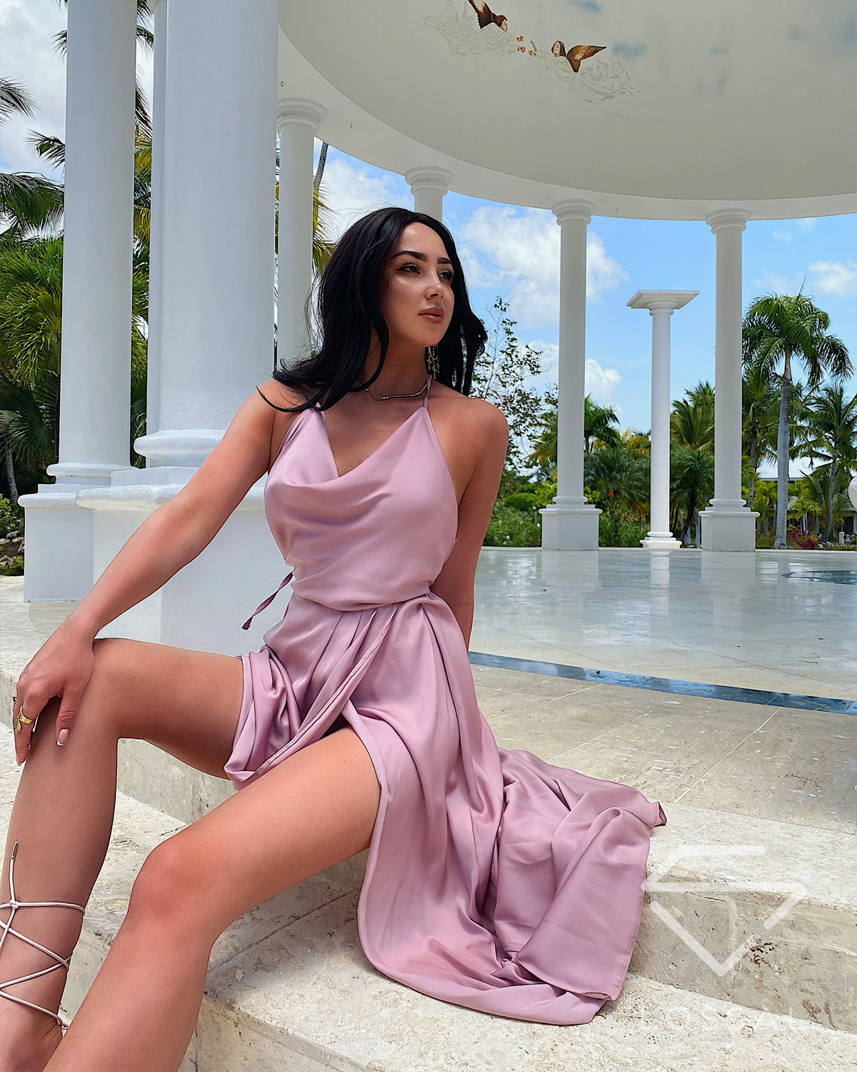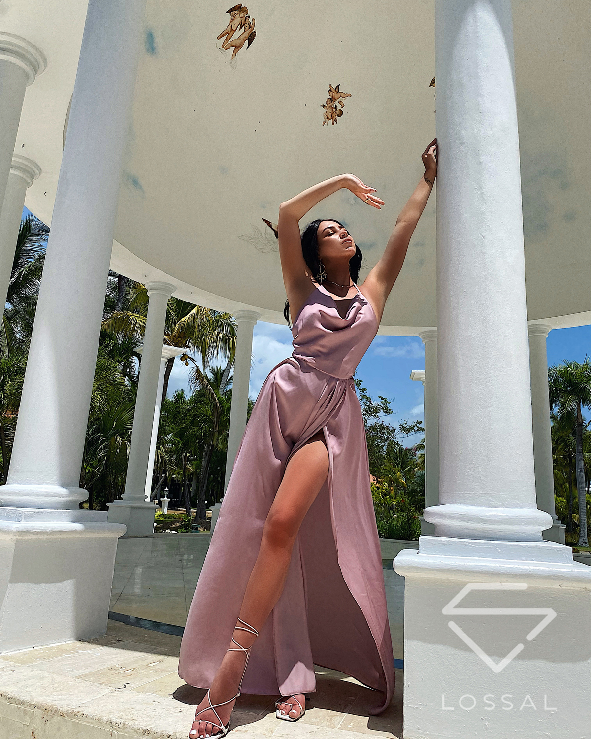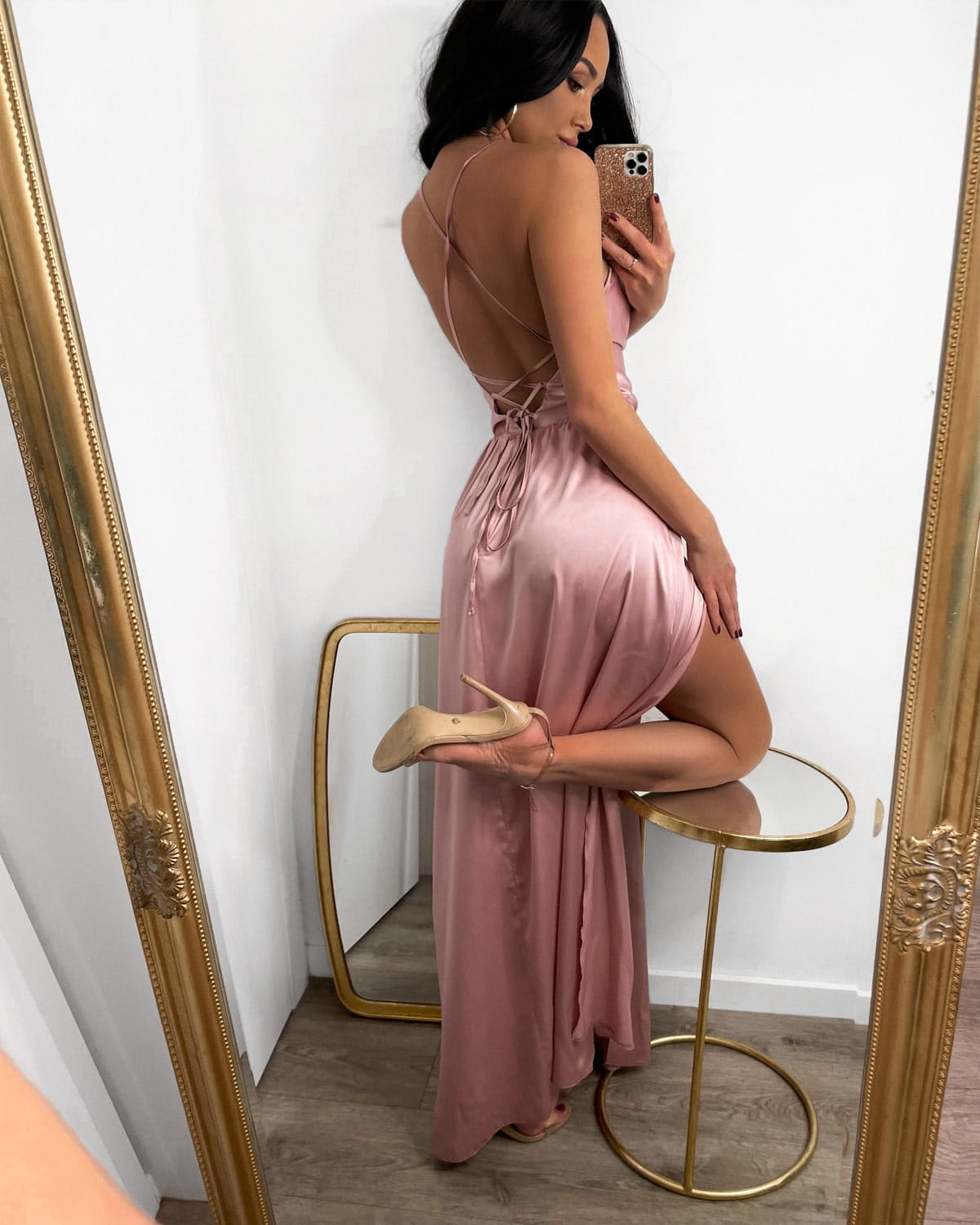 ASTRAL pudrowa różowa wieczorowa długa sukienka satynowa